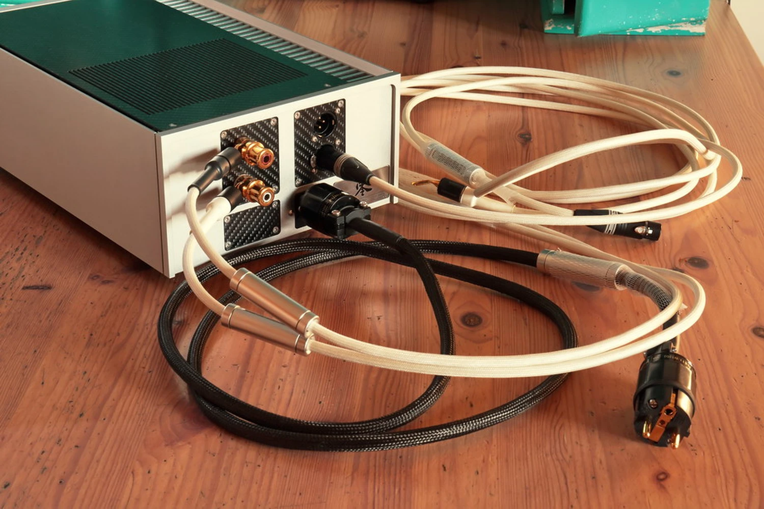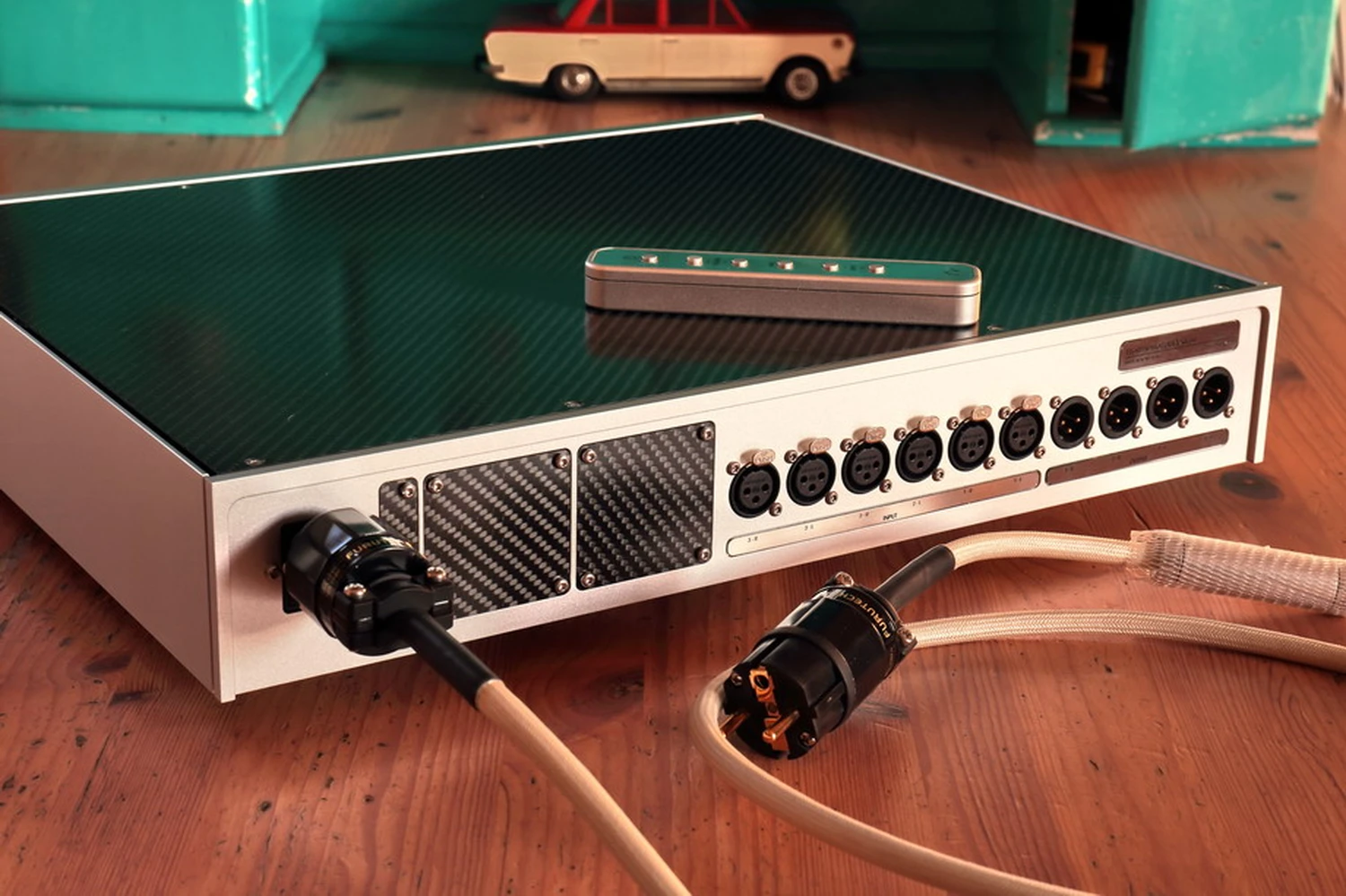 Non seulement les panneaux supérieur et inférieur sont en fibre de carbone, mais certains éléments à l’intérieur de l’appareil, le panneau supérieur, les capots arrière et les plaques de montage avec une LED et une prise de courant. Cette dernière est de haute qualité avec des contacts plaqués or de Furutech, tout comme le fusible intégré. Les prises XLR plaquées or sont des produits de Neutrik.