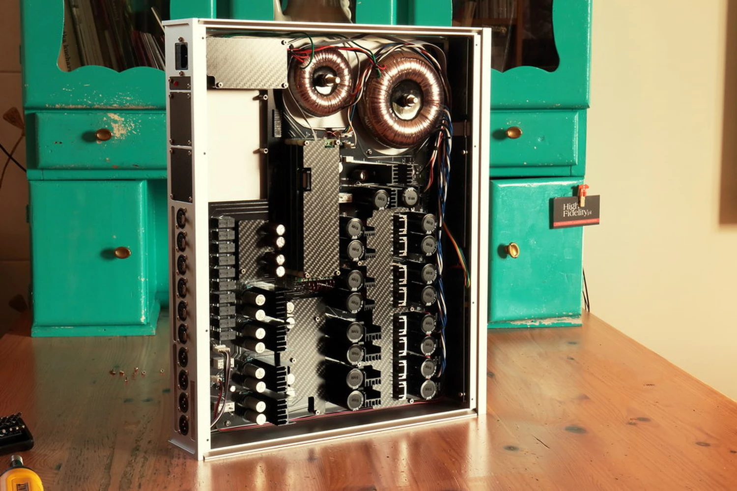 Nous trouvons des BJT par ON Semiconductor. Les BJT sont des Bipolaires à faible VCE (sat). Leur utilisation dans un amplificateur de classe A est assez rare car ils sont très difficiles à contrôler à haute température, contrairement aux MOSFET. À l’entrée de l’étage de sortie, vous pouvez voir un système de pilote complexe avec ses propres petits dissipateurs de chaleur. L’ensemble du châssis est fabriqué en aluminium de qualité aéronautique 6063. Ce sont des produits uniques en leur genre, et ils ont vraiment une belle apparence.