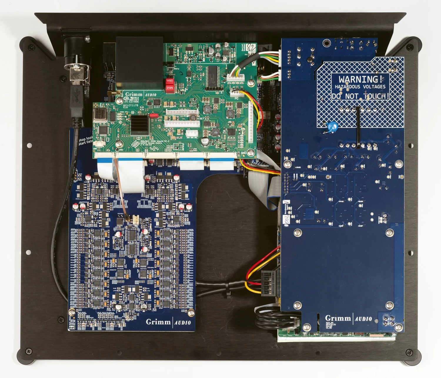 Pour expliquer davantage ce qui rend ce DAC si spécial, je laisse la parole à Eelco Grimm – directeur créatif de Grimm Audio. “Notre Major DAC entièrement développé en interne, qui ressemble à une sorte de variante DSD modifiée, fonctionne non pas avec deux mais avec trois niveaux. Contrairement à la technologie numérique existante où il n’y a que du 0 et du 1, nous avons créé 1,5 bit avec notre Major DAC. Cela fonctionne comme suit : 0 est 100 % du temps 0. Un 1 est 50 % du temps 0 et 50 % du temps 1. Et le 1,5 est 100 % du temps un 1. La raison pour laquelle nous avons opté pour cette forme de conversion est d’éviter les problèmes de modulation typiques du DSD à 1 bit. Je suis très fier que le développement de trois ans ait été entièrement réalisé en interne, par le concepteur de traitement du signal et de système Gertjan Groot Hulze et le concepteur électrique et système Pieter Meijer. La raison pour laquelle nous avons pris cette direction est principalement liée aux imperfections des conceptions de conversion existantes. Ainsi, avec le DSD, le haut spectre ne suit pas linéairement l’intensité du signal, et par conséquent, le bruit dans la bande audio des solutions multibit est également presque impossible à obtenir complètement linéaire. Naturellement, notre conception à 1,5 bit est toujours confrontée à un bruit de fond particulièrement élevé. Il est donc nécessaire de bien filtrer ce bruit, et pour cela, nous utilisons un shaper de bruit de 11e (!) ordre. C’est extrêmement raide, et pour réaliser cela, un algorithme intelligent et un processeur puissant sont nécessaires. Celui-ci est bien sûr standard dans notre MU2 et consiste en un FPGA (Field Programmable Gate Array) puissant. Enfin, nous utilisons dans la MU2 nos propres horloges Grimm. Des trésors coûteux qui, comme pour le MU1, sont mesurés séparément et donc sélectionnés manuellement avant d’être finalement intégrés sur le circuit imprimé.”