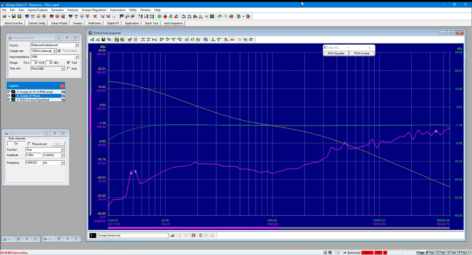 Nous avons principalement testé avec le Technics SL1200 MK2 et l’élément Le Son LS10 MK2. Cette combinaison était tout simplement délicieuse. L’élément LS10 MK2 est rapide, très aérien dans son caractère et apporte beaucoup de détails. (La critique complète est ici). Il apporte juste un petit quelque chose de plus que le déjà excellent Le Son LS1 à haute sortie. Le Thorens TD160 avec MM AT VM95SE est définitivement une excellente platine qui procure beaucoup de plaisir. Et vous pouvez en obtenir une décente pour moins de 500 euros (d’occasion), mais les limitations de l’élément VM95SE sont audibles si nous le comparons aux deux autres platines. À juste titre : le LS10 MK2 coûte presque 1000 euros. L’AT VM95SE coûte moins de 50 euros. Nous entendons juste un peu moins d’ouverture, de raffinement, de détails… Et pourtant, même cela sonne bien. Mais maintenant que nous avons expérimenté les deux autres, il n’y a pas de retour en arrière. Ce que nous voulons montrer avec cela, c’est que le Grimm PW1 montre très clairement les différences ; c’est un passage très transparent. Ce préampli phono évolue avec vous sans effort. Nous allons bientôt tester un Rega P10 sur le Grimm PW1. Nous sommes curieux de voir comment cela se déroulera. Parce que cela donne certainement envie de plus ! Nous avons mesuré le Grimm PW1 avec notre Prism dScope IIIE. Nous avons mesuré à la fois en MC et MM. Nous avons terminé l’entrée ouverte avec un bouchon de court-circuit. Cela permet d’éviter les interférences. Nous avons fini par le mesurer en mode single-ended pour le garder comparable à d’autres mesures. Franchement, cela n’a pas fait beaucoup de différence dans les mesures. Nous avons également effectué une autre mesure du côté de l’alimentation du Grimm PW1. Cela a été fait avec le Tekbox LISN et le Picoscope 5000.