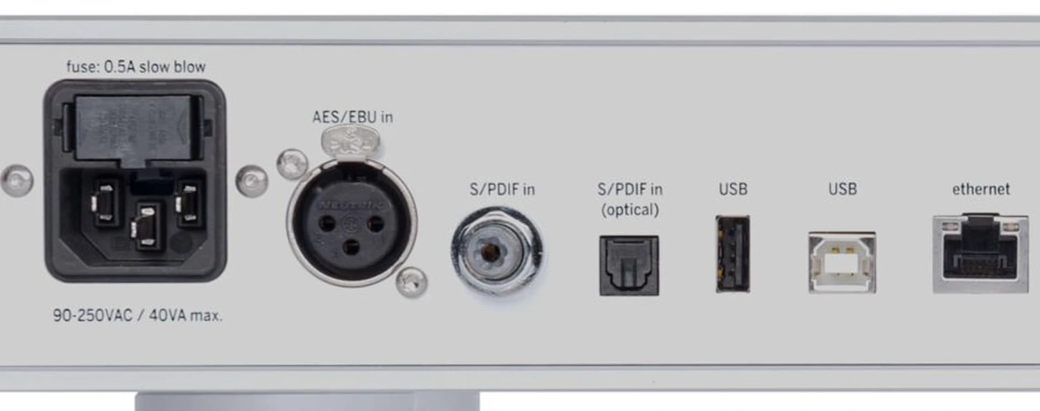 Il y a cinq options d’entrée numérique. Cela inclut AES/EBU ou S/PDIF via XLR, Toslink ou RCA ; RJ45 Ethernet ; et USB type B.