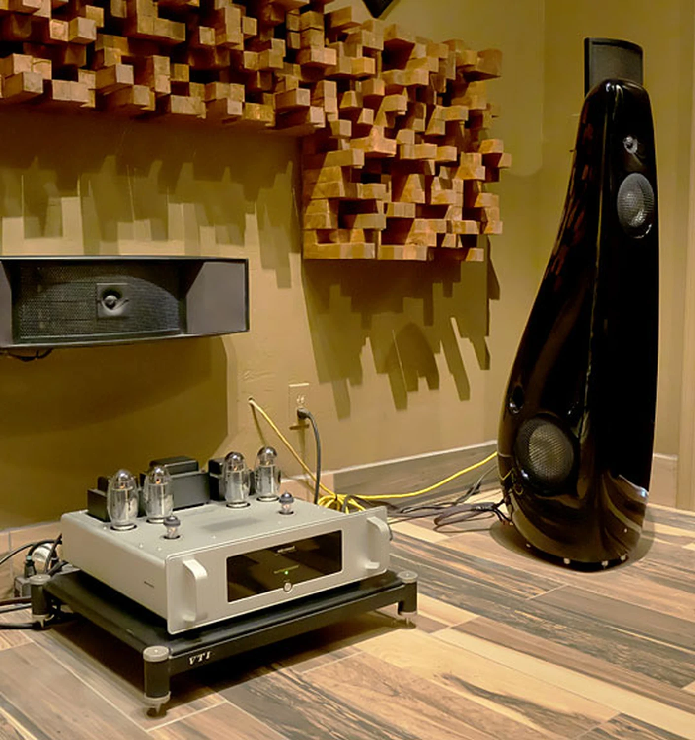 Dans une rare occurrence, la salle d’écoute était remplie d’amplificateurs. L’amplificateur Bryston 4B-SST2 de confiance que je possède, l’amplificateur stéréo Audio Research VT80 SE actuellement en test, et plus tard dans la période de test ; une paire de puissants amplificateurs mono Pass Lab X260.8. Mes connexions étaient avec un câble haut-parleur Audioquest Rocket 44 standard, directement depuis l’amplificateur de mon choix. Quel amplificateur utiliser ? Je sais. Parfois, la vie est dure. L’amplificateur Audio Research VT80 SE était déjà en place, donc il aurait le plaisir de faire le burn-in. Les Vivid Audio Kaya 45 sont classés à 6 Ohms (2,8 Ohms min), avec une recommandation d’amplificateur de 25 à 500 Watts. Chacun des trois amplificateurs disponibles correspondrait à ces spécifications. Les Kaya 45 ont une sensibilité signalée de 87 dB/W/m à un mètre sur l’axe et une plage de fréquence de 37 Hz à 25 kHz.
