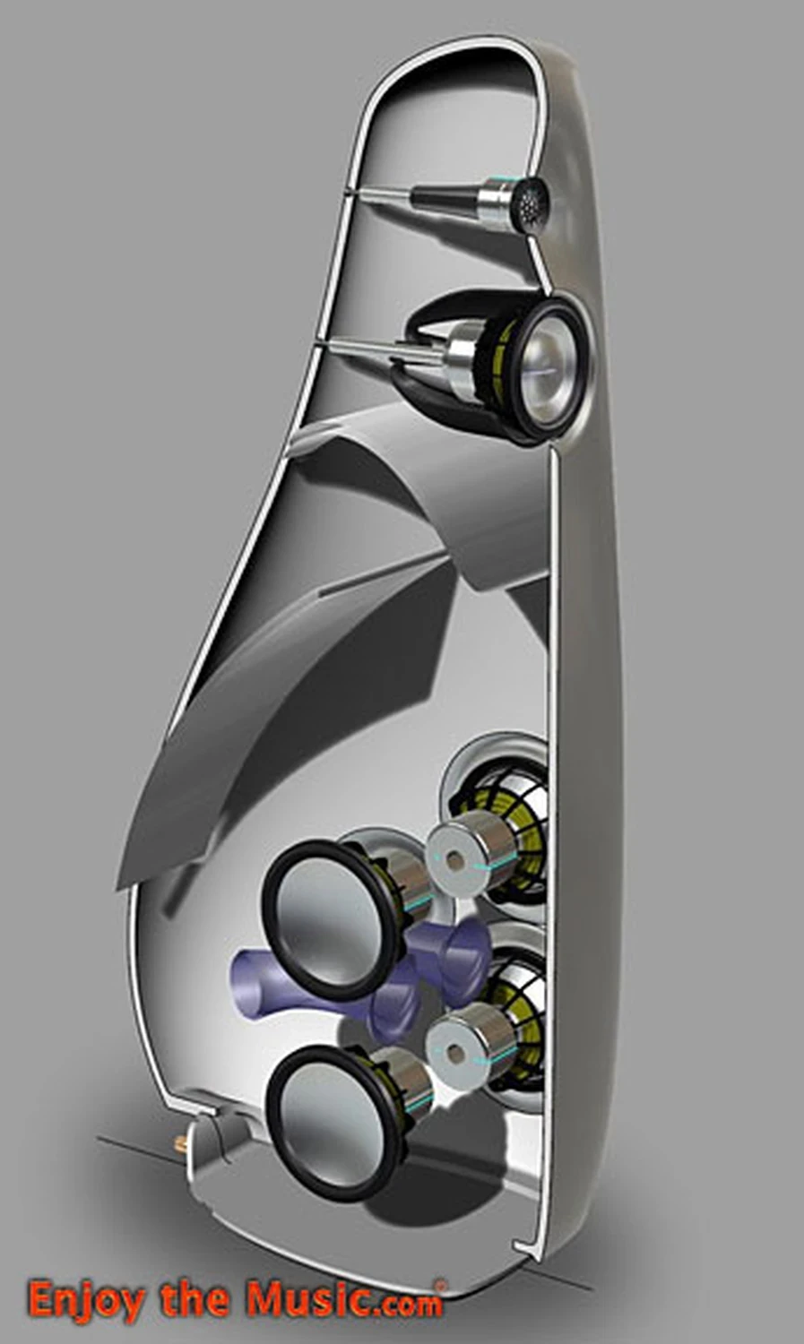 Les haut-parleurs Vivid Audio Kaya 45 mesurent environ 45 pouces de haut et possèdent des sections supérieures et inférieures conventionnelles, qui abritent le tweeter, le midrange et les drivers basses. Malgré leur apparence, l’enceinte du Kaya 45 est assemblée à partir de trois pièces de fibres de verre moulées, liées ensemble. Le matériau de l’armoire est décrit comme un composite sandwich renforcé de verre, avec un noyau Soric. Encore une fois, aucune ligne de joint n’est visible à l’œil nu. Le processus est très impliqué et produit une armoire très rigide (mais légère). Faire le “tapotement des jointures” sur l’armoire vous laissera juste avec des jointures douloureuses. La forme arrondie n’est pas seulement pour des raisons esthétiques, mais est conçue pour éliminer la diffraction externe. Les Kaya 45 sont un système à trois voies et quatre drivers, avec des drivers fabriqués en interne qui sont aussi uniques qu’attrayants pour les oreilles.