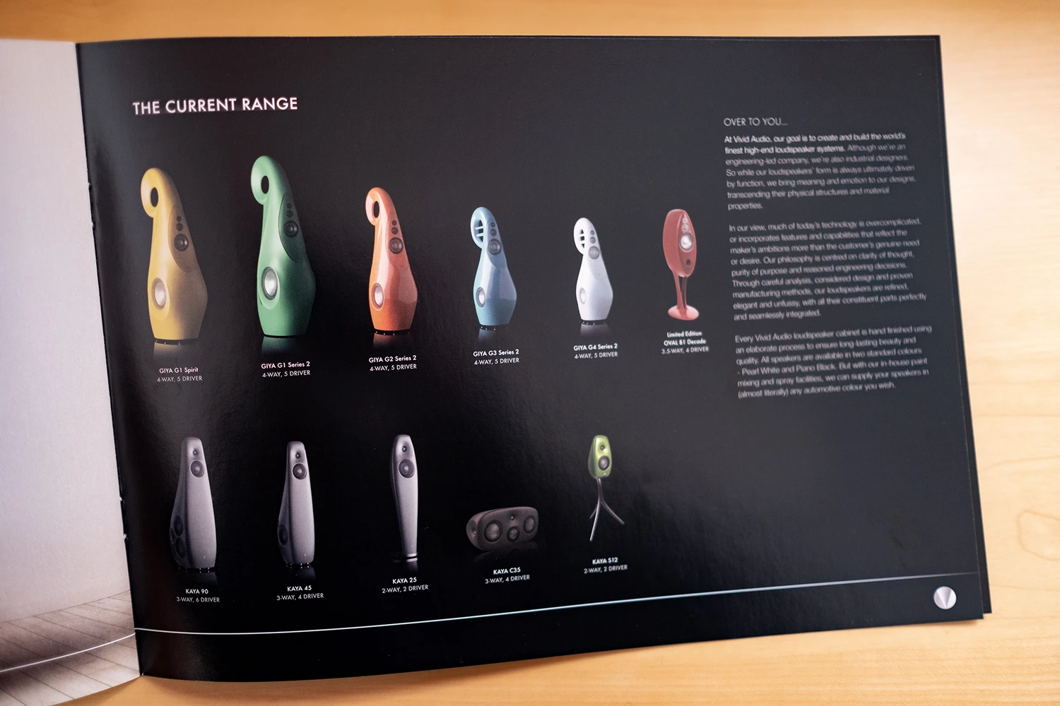 La gamme actuelle de Vivid Audio se compose de 10 enceintes réparties en trois gammes de produits : GIYA, KAYA et OVAL. Chaque enceinte Vivid Audio est fabriquée dans l’usine basée en Afrique du Sud de l’entreprise, où de nombreuses pièces sont fabriquées à la main. Les passionnés d’enceintes seront déconcertés en essayant de découvrir l’origine des pièces car Vivid fabrique principalement ses propres composants, y compris les haut-parleurs.