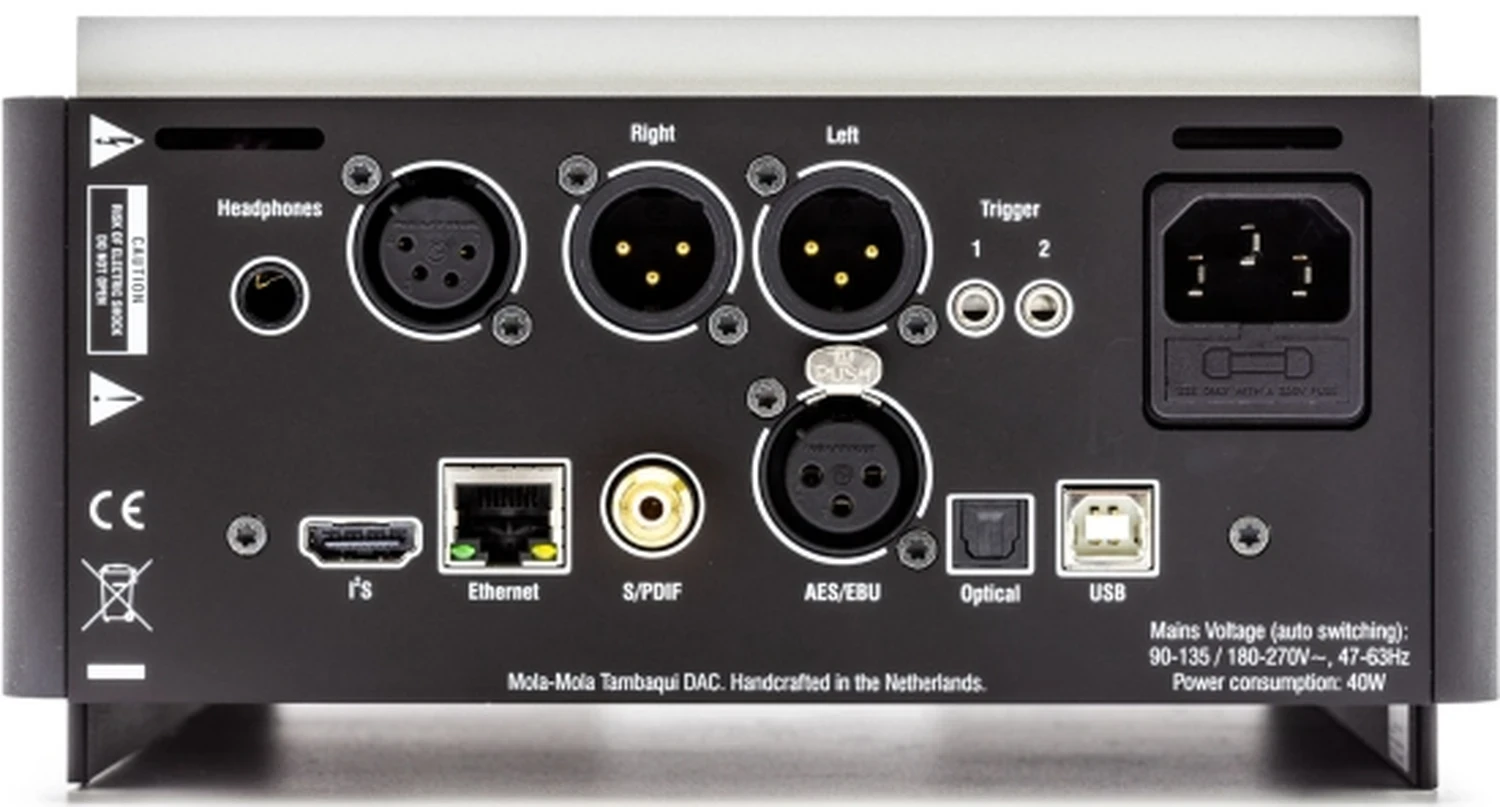 En plus de l’I2S, du S/PDIF coaxial, de l’AES/EBU, du TOSlink et de l’USB, le Tambaqui est également RoonReady, et il offre une entrée réseau RJ45 qui peut être utilisée pour diffuser des signaux Roon vers l’unité. À l’intérieur se trouve un véritable endpoint/récepteur réseau qui rend les streamers externes superflus. Les sorties analogiques ne sont disponibles que sur XLR, mais il y a aussi une sortie casque à l’arrière qui peut être contrôlée séparément via le logiciel de contrôle à distance Mola-Mola pour iOS et Android, pouvant fonctionner sur un téléphone ou une tablette. Le Tambaqui peut traiter le PCM jusqu’à 384 kHz / 32 bits (>192 kHz et >24 bits via USB et Roon uniquement) et le DSD DoP et natif jusqu’à vitesse quadruple (USB et Roon uniquement).