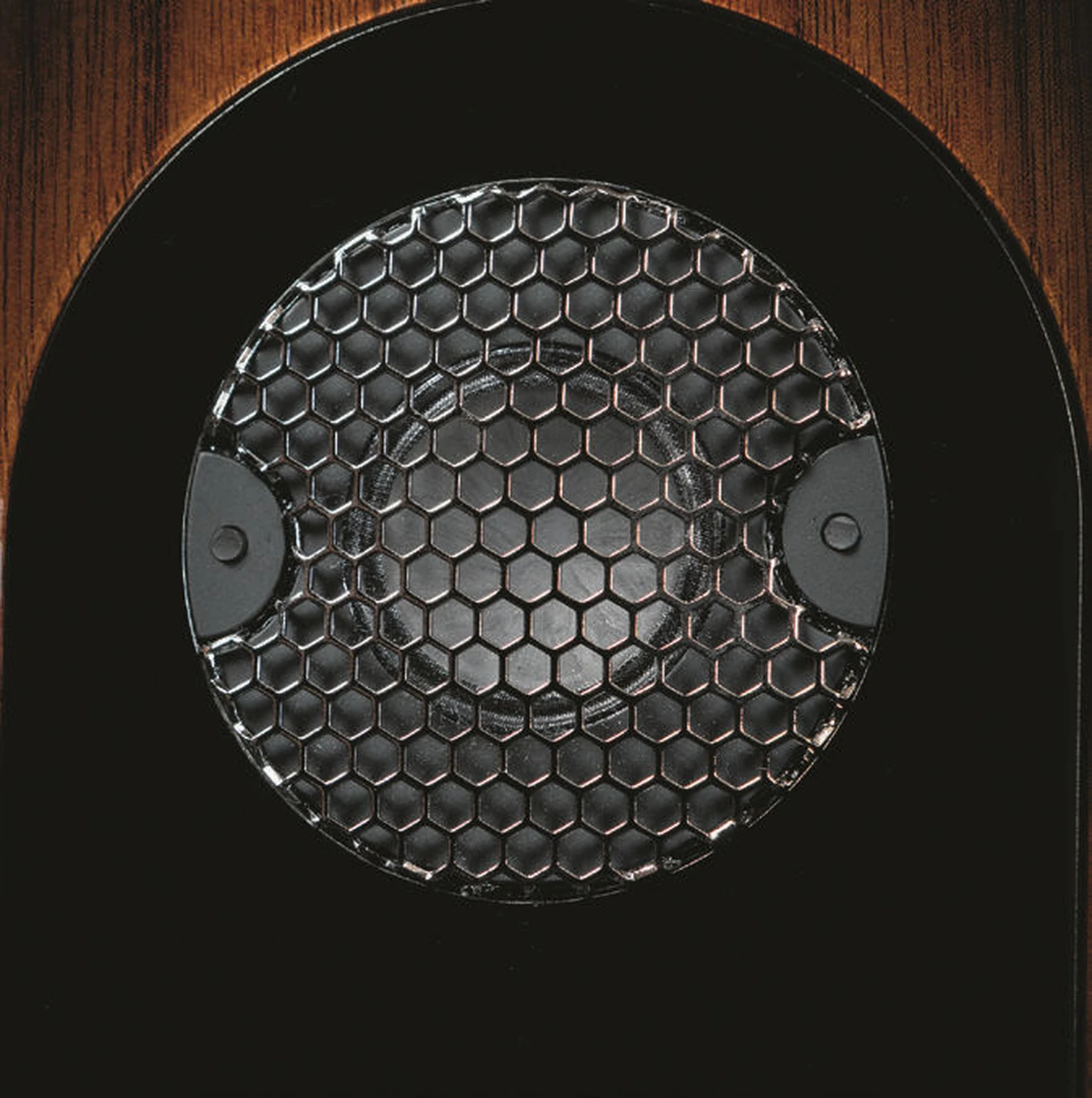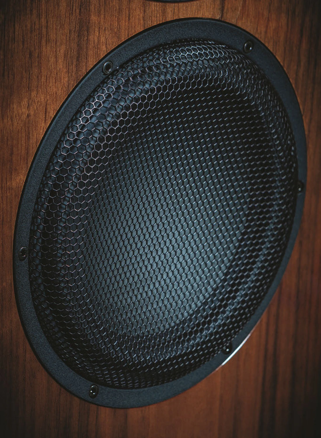 Les aigus de toute la série Parker sont confiés à un dôme en corindon de 25 mm, dissimulé derrière une grille métallique fixée de manière permanente. En dessous de 2200 Hz, deux haut-parleurs céramiques de 19 cm prennent le relais. Leur membrane légère et rigide, dotée d’un large cache-noyau, est animée par un énorme aimant, tandis qu’une grille métallique protège sa surface fragile des dommages mécaniques. Deux membranes passives en aluminium de 22,5 cm, montées à l’arrière, bénéficient d’une protection identique.