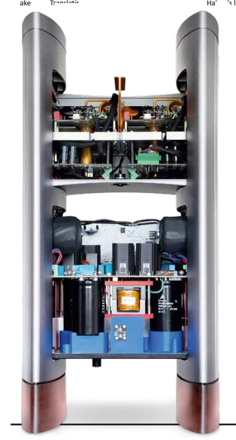 Et cela nous amène à jour avec la série Eclipse, le résultat d’une re-conception considérable, sans parler de la re-fabrication et de la redéfinition de cette forme emblématique, qui est maintenant un peu plus douce et plus courbée, finie à un niveau encore plus élevé. Le boitier anodisé en argent de l’ancien design, décrit par un critique comme ayant tendance à « sonner comme une vieille cloche d’église d’Adélaïde », a été remplacé par de l’aluminium massif usiné beaucoup plus lourd, avec les deux enceintes formant les barres transversales entre les montants fabriquées à partir de tôle d’aluminium jusqu’à 1 cm d’épaisseur. Et il y a même plus dans ces boîtes que ce qu’il semble. Le boîtier inférieur, plus grand, contient l’alimentation, complète avec une entrée IEC et un interrupteur d’alimentation principal, tandis que la section supérieure abrite les étages d’amplification d’entrée et de sortie, chacun protégé des autres par plus d’aluminium et de cuivre. Chaque partie de la structure de l’amplificateur est pulvérisée à la main avec plusieurs couches de peinture de qualité aérospatiale, et l’ensemble de l’entreprise repose sur des pieds sculptés à la main dans du bois par un luthier local – ou fabricant de guitares pour vous et moi. Dans la version standard, les pieds sont en acajou tandis que, pour la version Premier, ils sont en Redgum australien vieilli, apparemment recyclé à partir de poteaux de clôture vieux d’un siècle… Pendant ce temps, de nombreux circuits ont été reconfigurés et leurs composants améliorés, le nouveau Halcro maintenant capable de maintenir les niveaux de furtivité et de mystère de l’ancien Halcro en peignant certaines parties et en enfermant des sections vitales dans de l’époxy pour garder leurs secrets (ou les étouffer, selon comment on le voit). Et avec des fixations invisibles qui servent en outre à rendre l’ensemble difficile à démonter – étant un amplificateur à jouer, pas à jouer avec – tout ce que le propriétaire doit vraiment savoir, c’est où trouver l’interrupteur pneumatique sous le boîtier de l’amplificateur. Avec un léger sifflement, provenant de l’interrupteur, l’amplificateur passe de veille (lumière rouge) à opérationnel (lumière bleue). Le câblage entre les deux boîtiers est caché dans les montants, qui dispersent également la chaleur de l’amplificateur à transistors FET relativement peu énergivore. Les connexions à l’arrière du boîtier supérieur (amplificateur) acceptent des entrées RCA non équilibrées ou XLR équilibrées, plus des RCA supplémentaires offrant un mode à demi-gain avec une impédance d’entrée très basse de 660 ohms. Les bornes de câbles de haut-parleurs sont de type combinaison spade/banane. La puissance de sortie est donnée comme 180W/8ohm, et 350W par côté en 4ohm, avec une protection étendue intégrée contre les courts-circuits accidentels, les surintensités, le décalage DC, les transitoires secteur et probablement même les attaques de possums – Halcro a toujours été soucieux de protéger ses amplificateurs des utilisateurs. Enfin, l’ensemble pèse un poids substantiel de 62 kg, donc nécessite deux personnes pour le déplacer en position.