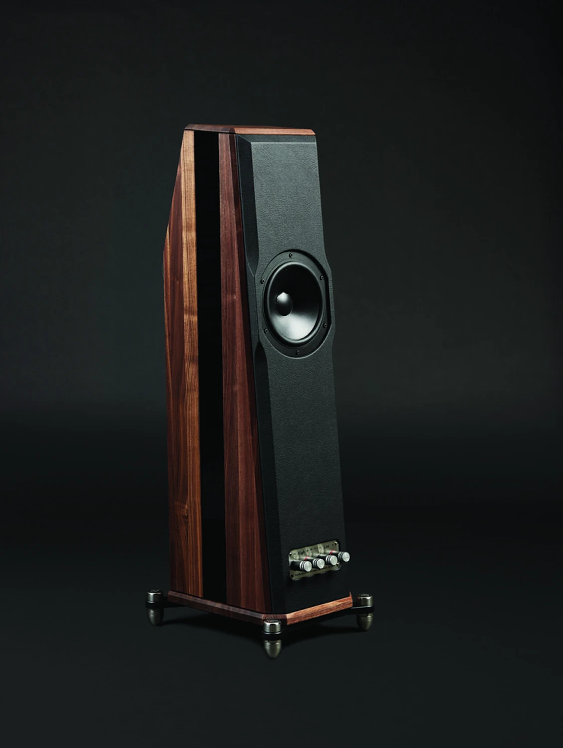 La façade avant, où sont montés les haut-parleurs, est inclinée vers l’arrière pour un alignement temporel optimal, avec des facettes subtiles pour minimiser la diffraction. Le panneau arrière, quant à lui, s’incline vers l’avant, évitant les faces parallèles. Le coffret se rétrécit donc du bas vers le haut, ce qui contribue à réduire l’impression de taille tout en conservant une base suffisamment large pour assurer la stabilité. Une bande en acrylique noir brillant descend de chaque côté, brisant l’apparence « bloc de bois ».