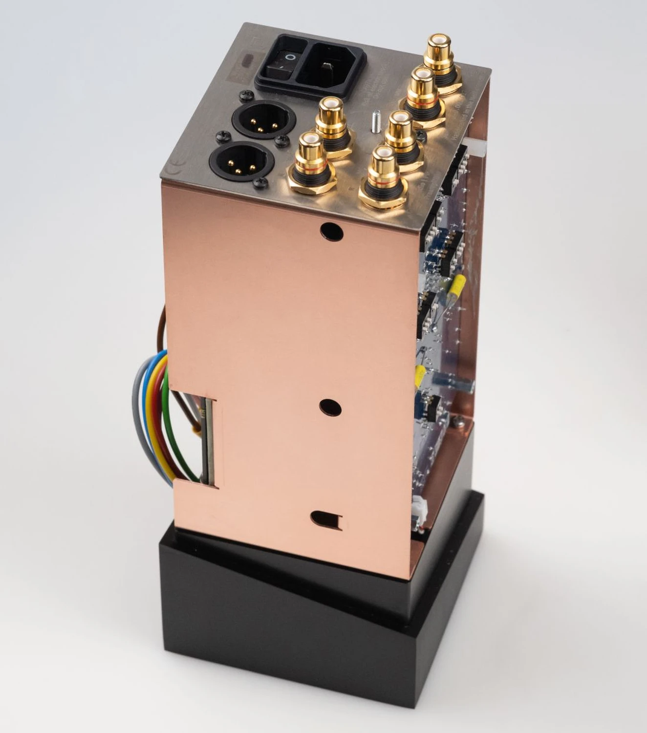 De plus, la plupart de la distorsion provenant des circuits FET est de type harmonique secondaire inaudible. Le stade d’amplification FET unique et l’absence de correction par rétroaction expliquent pourquoi le PW1 a un chiffre de distorsion harmonique relativement plus élevé par rapport à certains concurrents. Une caractéristique clé du PW1 est qu’il ne nécessite pas de boîte d’alimentation externe séparée, réduisant ainsi le risque de bourdonnement et d’interférence sur les entrées MC et MM. En collaboration avec Amplimo, l’équipe de Grimm Audio a développé un transformateur d’alimentation à champ magnétique extrêmement faible, conçu par Guido Tent. Il est si bien blindé qu’il peut être placé directement au-dessus de l’entrée MC sans effets néfastes ! Néanmoins, le transformateur est positionné en interne à une distance généreuse de 20 cm, garantissant l’absence de bruit. Le cabinet est fabriqué à partir de matériaux non magnétiques, utilisant de l’aluminium pour l’enceinte et un sous-châssis en cuivre pour un meilleur blindage de l’entrée secteur et de l’alimentation.