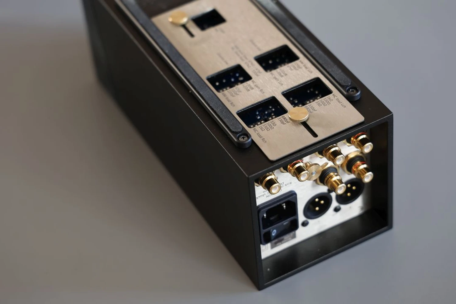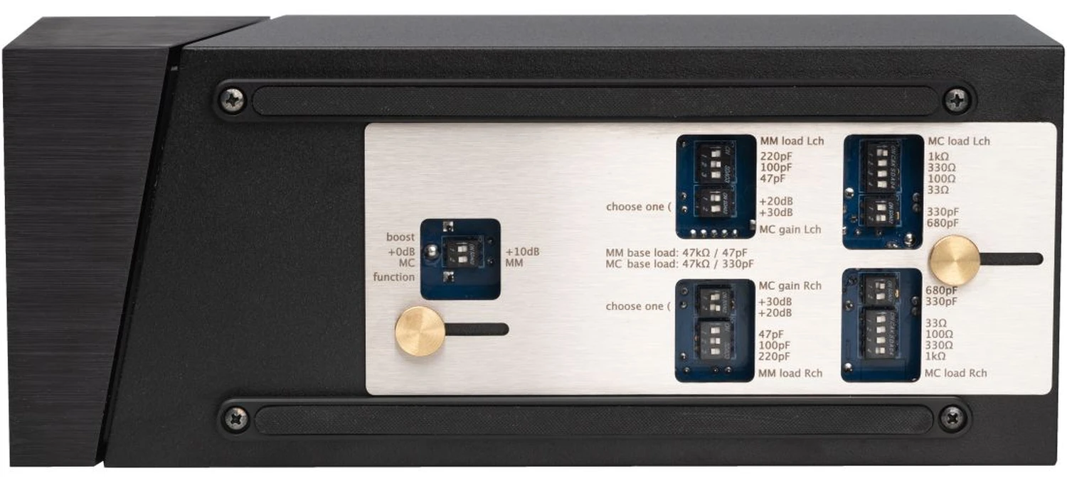 Le PW1 dispose d’entrées séparées dédiées pour MM et MC et offre des réglages polyvalents pour divers cartouches. Tous les réglages de charge peuvent être accessibles via un panneau coulissant en bas. Pour y accéder, l’unité peut être retournée pendant l’expérimentation. Pour ceux qui préfèrent ne pas expérimenter, le manuel fournit un tableau avec des réglages recommandés pour les cartouches MC (bobine mobile), MC à haute sortie, et MM (aimant mobile). Les expérimentateurs apprécieront les nombreuses options disponibles. Pour affiner le comportement des cartouches, le PW1 propose trois réglages de capacité de charge MM, quatre réglages de résistance MC et deux réglages de capacité de charge. Le gain MC est réglable à 0, +20 ou +30 dB, et un gain de sortie supplémentaire sélectionnable de +10 dB est également disponible. Avec le gain maximal activé, le PW1 peut atteindre 77 dB, soit plus de 7 000 fois d’amplification, le rendant adapté aux cartouches à ultra faible sortie avec des sorties aussi basses que 0,05 mV. Cette configuration produit un bruit minimal, car le niveau de bruit inhérent de la section MC est exceptionnellement bas. Les cartouches MM peuvent utiliser une capacité de 47 pF, 100 pF ou 220 pF. Certains fabricants proposent même des valeurs plus élevées, mais Grimm estime que cela est inutile. Des valeurs plus élevées, telles que 1000 pF, peuvent créer des pics indésirables dans la courbe de fréquence. Les cartouches MC, qui sont moins sensibles à la capacité, peuvent utiliser 330 pF ou 680 pF selon les besoins. En même temps, le réglage de charge principal pour les MC est résistif, nécessitant typiquement 5 à 10 fois leur résistance interne. Après avoir effectué les ajustements nécessaires, le panneau inférieur peut être glissé en arrière pour couvrir tous les commutateurs DIP, et l’unité peut alors être repositionnée à la verticale. Les éternels bidouilleurs, comme moi, peuvent la laisser à l’envers en permanence, sans effets néfastes.