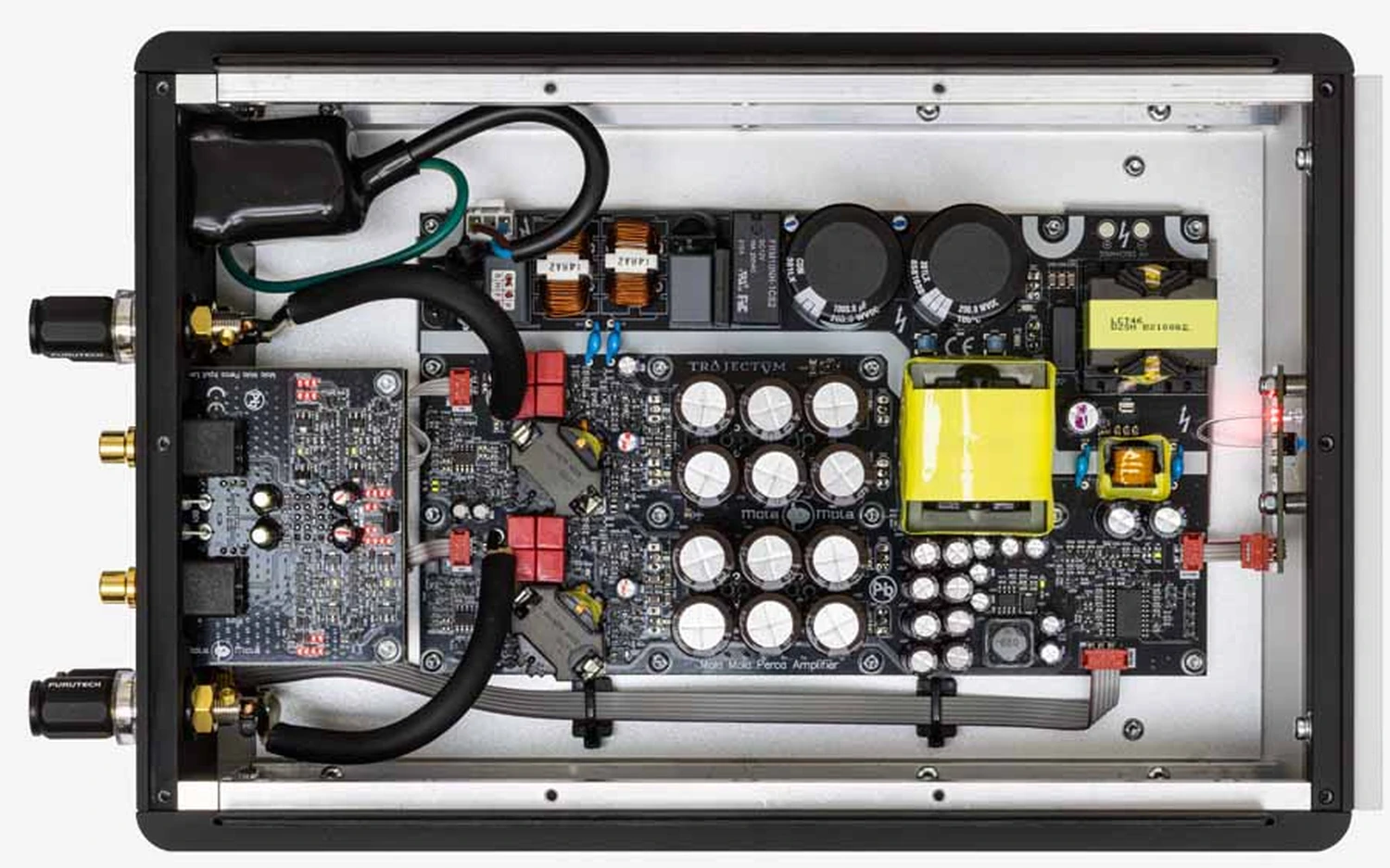 Selon Mola Mola, la distorsion sur le Trajectum est réduite d’au moins 20 dB et comme la conception se concentre sur les 50 premiers watts de puissance de sortie (_dans mon système, mes compteurs dépassent rarement 4 W !_), la distorsion de cette première étape est réduite de 40 dB. De plus, le bruit de l’amplificateur est réduit de 3 dB sur un design déjà silencieux de l’amplificateur NCORE®, et la bande passante de fréquence est encore augmentée, et l’amplificateur est moins affecté par le bruit de l’alimentation. Bien sûr, étant de classe D, cette alimentation est un mode de commutation personnalisé à l’intérieur du boîtier. L’étage d’entrée, cependant, est un design de classe A à ultra-basse distorsion sur sa propre carte, complète avec sa propre régulation de tension. J’ai vu plusieurs hybrides comme celui-ci dans le passé, et ils semblent tous bien fonctionner. La société est fière de créer des amplificateurs et des convertisseurs “dont le signal de sortie ne peut être distingué, à l’oreille, du signal d’entrée”. C’est un amplificateur de puissance de 150 W en 8 ohms (300 W en 4 ohms) qui correspond au DAC Tambaqui à 10 000 £ de la société, et qui est très éloigné de mes amplificateurs de classe A lourds, grands et énergivores qui diminuent les lumières chaque fois que j’essaie de les allumer. Avec juste un petit bouton sur le devant pour réveiller cette beauté, le bord supérieur central possède une petite LED.