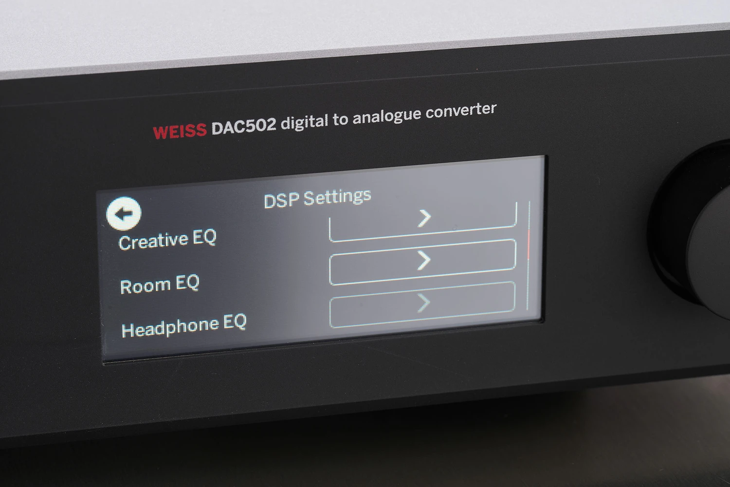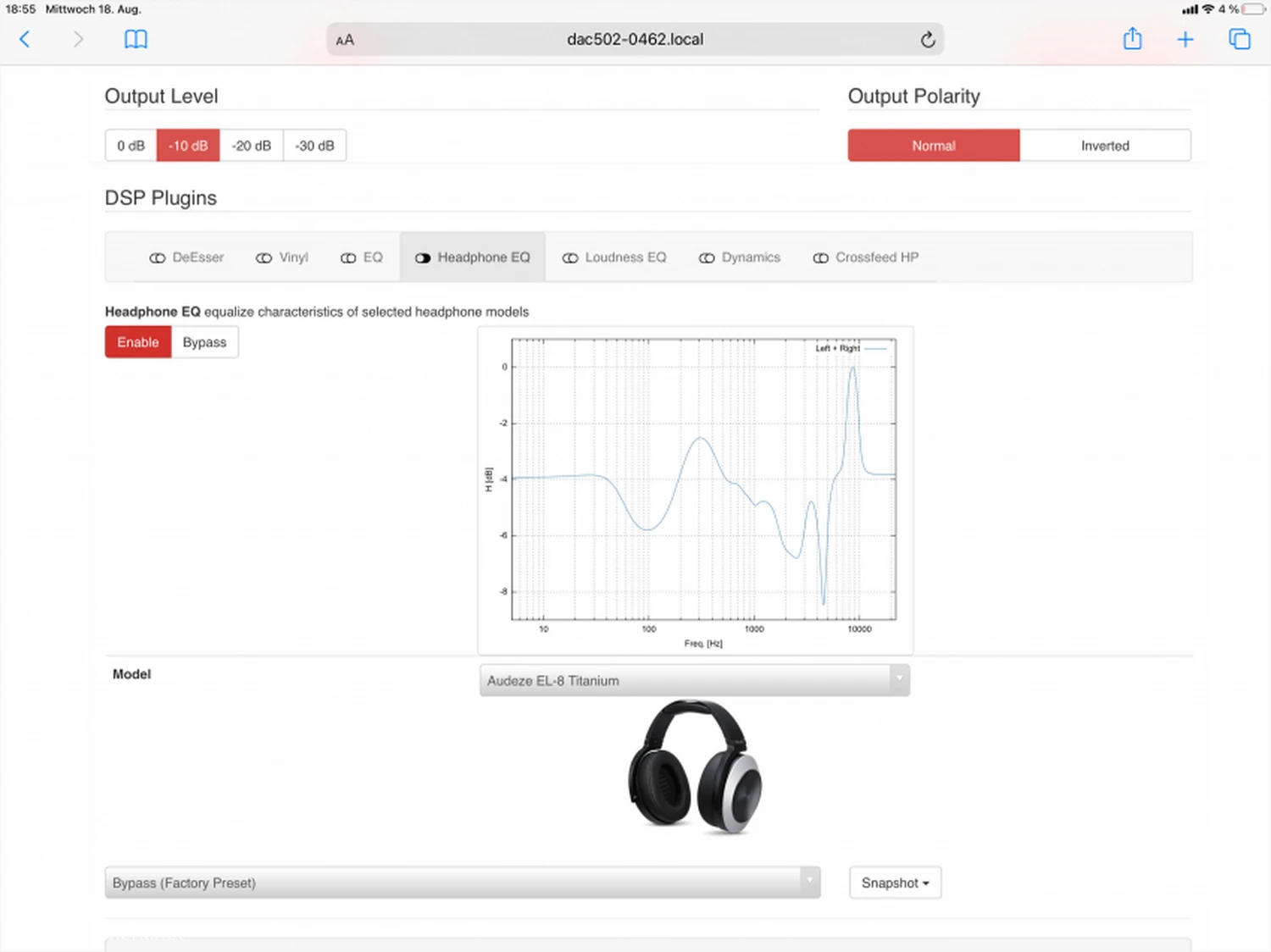 Le DAC502 tire son énergie de deux alimentations linéaires. Le convertisseur et les étages de sortie construits de manière discrète ainsi que les amplificateurs pour casque se trouvent sous un écran de protection. Avant de comparer le Weiss à la chaîne du salon avec le Mytek Manhattan II, je teste ce que les sorties casque du DAC502 ont à offrir en association avec les plugins DSP programmés à cet effet. Pour commencer, l’Audeze EL-8 Titanium est à l’honneur, que j’ai un peu libéré avec un album d’ECM. Lorsque je lance “Big Time Operators” de _Too Long In Exile_ de Van Morrison, une production pop qui, bien que musicalement convaincante, est techniquement moyenne, je dois d’abord réduire le volume. Comme c’est souvent le cas dans ce genre, la musique est fortement compressée, mais ce n’est pas tout : les basses semblent légèrement exagérées et la guitare électrique perce un peu le tympan. La première solution consiste à réduire le niveau, puis à activer l’« égaliseur casque », qui offre des égalisations spécifiques pour 19 modèles Audeze, y compris l’EL-8 Titanium : ainsi, la réponse en fréquence apparaît beaucoup plus équilibrée, de sorte que l’Audeze ne semble pas plus envahissant même avec deux ou trois décibels de plus.