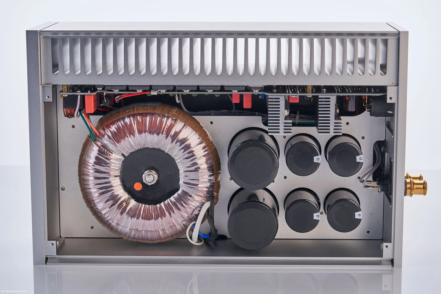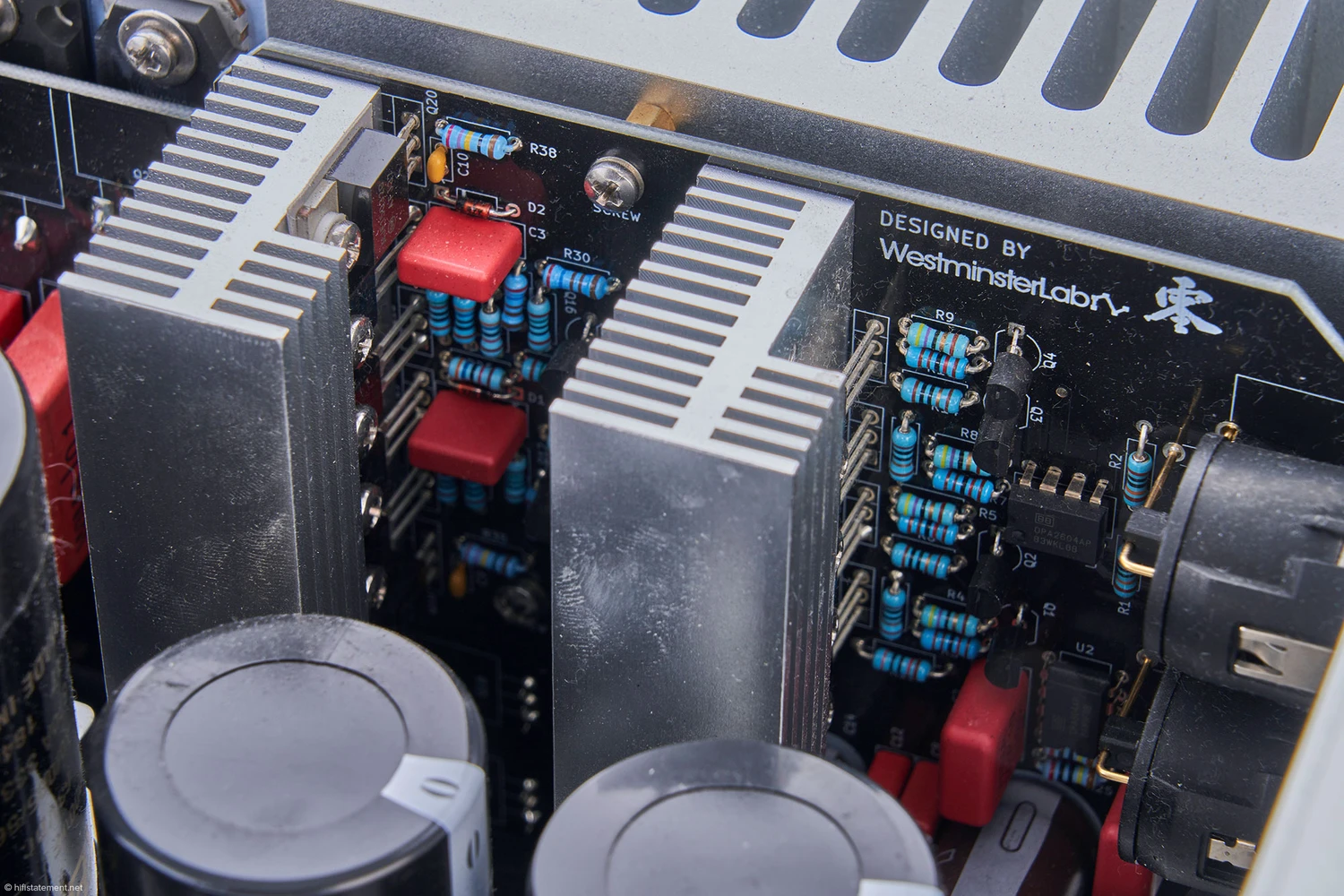 Viel Aufmerksamkeit hat man auch der Mechanik des Verstärkers geschenkt: So gibt es in seinem Inneren zwei tragende Aluminiumkonstruktionen, je eine für die Stromversorgungskomponenten und eine für die Verstärker-Elektronik, so dass die vom Netzteil erzeugten mikromechanischen Schwingungen bei der Netzfrequenz und ihren Oberwellen so gut wie nicht auf die Audioschaltungen übertragen werden können. Um negative Auswirkungen von Luftschall, der auf die Kühlkörper trifft, zu minimieren, hat WestminsterLab mit Hilfe finiter Simulation, Prototypenbau und kritischen Hörtests einen Kühlkörper mit einem asymmetrischen Lamellendesign entwickelt, dessen Resonanzfrequenz sehr weit von kritischen Audiofrequenzen entfernt sein soll und der eine sehr effektive Wärmeableitung besitzt. Auch bei recht dynamischem Programmmaterial und in Kombination mit der Børresen 05 SSE mit einem Wirkungsgrad von 90 Dezibel pro Watt und Meter und wirklich kräftigen Pegeln wird die linke (Kühlkörper-)Seite der Rei nur etwas mehr als handwarm. Alles bestens also.