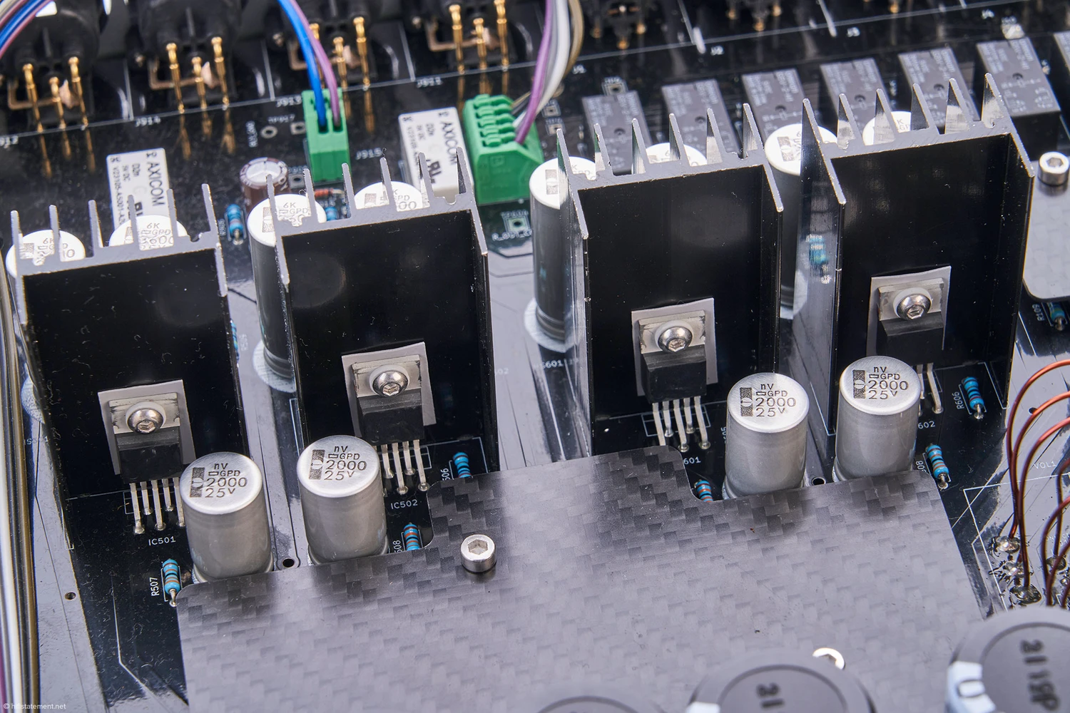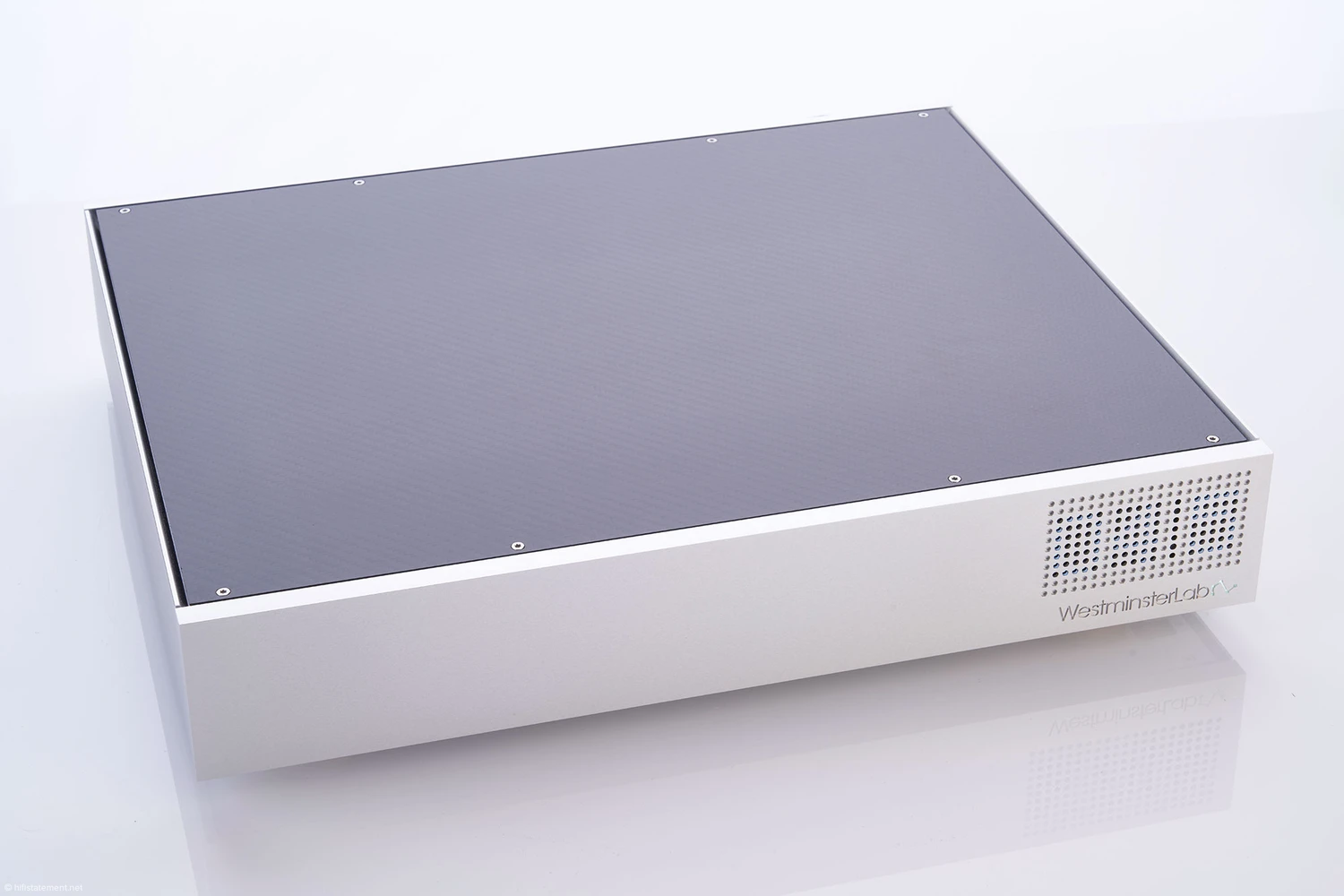 Doch zurück zu den Komponenten im Hörraum: Nicht nur das Erscheinungsbild der Vorstufe und der Monos ist recht außergewöhnlich, die für die Gehäuse verwendeten Materialien sind es auch: Außer den Frontplatten und den Kühlkörpern der Leistungsverstärker findet man für die Preisklasse der WestminsterLab-Verstärker unüblich dünne Aluminiumplatten und Gerätedeckel aus Kohlefaserplatten. Die Wahl letzterer wird im White Paper der Endstufen so begründet: „Ein Problem bei Metall ist, dass es tatsächlich hochfrequente Störungen aus der Umgebung absorbiert und diese dann in elektrisches Rauschen und magnetische Störungen umgewandelt werden, die sich auf das gesamte System auswirken und einen unscharfen und verrauschten Hintergrund ergeben. Deshalb verwendet WestminsterLab als Abschirmungsmaterial für Verstärker … weitestgehend Kohlefaser, die keine Magnetfelder und unerwünschten Wirbelströme erzeugt und im Gegenzug erstaunlicherweise Störungen ohne Absorption in die Umgebung abweist. Außerdem bietet sie eine sehr hohe Stabilität gegenüber Umgebungsbedingungen und eine extreme Steifigkeit, die zu geringen Resonanzen und Vibrationen führt.“ Für die Vorstufe bietet WestminsterLab gegen einen Aufpreis von knapp 1.000 Euro auch ein „Extended Carbon Pack“ an, das Karbonfaser-Abschirmung für den Eingangs-, Ausgangs-, Lautstärkeregelungs- und Stromversorgungsbereich umfasst.
