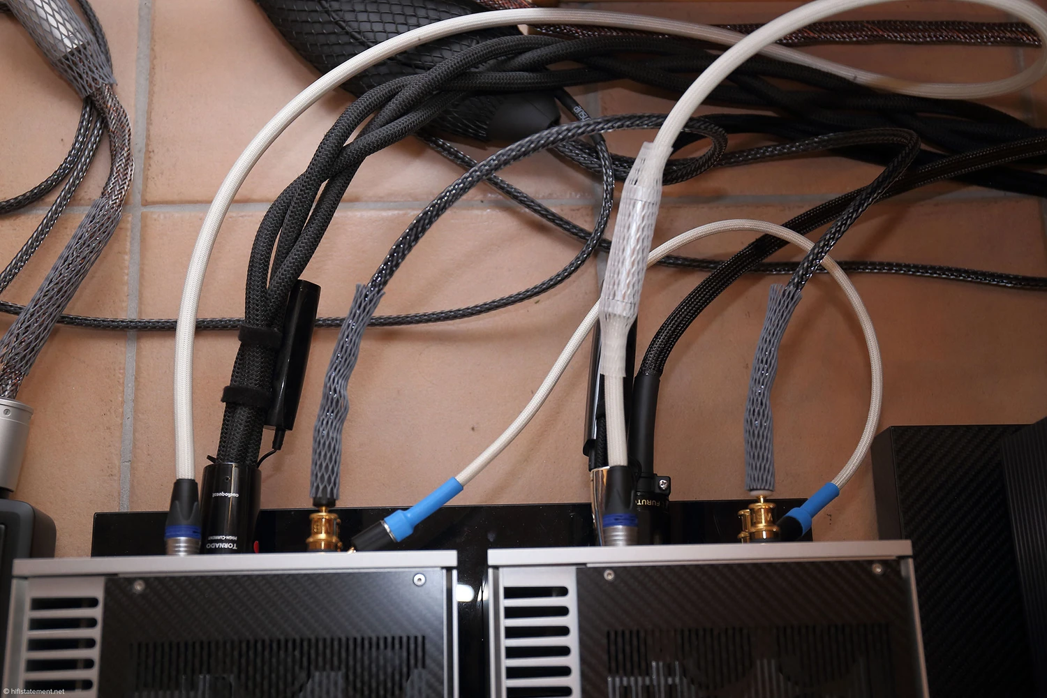 Le câble XLR blanc de Westminster connecte la sortie du premier amplificateur mono à l’entrée du second et inverse la phase. Malheureusement, je n’ai pas pu créer des conditions de travail exactement identiques pour les quatre amplificateurs Rei, car les deux monophoniques qui amplifiaient seuls tiraient leur énergie de deux câbles Audioquest Tornado HC de six mètres branchés sur un Niagara 5000. Les deux amplificateurs supplémentaires étaient connectés via des câbles d’alimentation WestminsterLab à une multiprise non filtrée. Heureusement, Angus Leung ne voyait pas le traitement inégal des deux amplificateurs en pont d’un canal comme un problème. Il était convaincu que les améliorations sonores seraient également évidentes dans ces conditions. En ce qui concerne le placement, il n’y a aucune différence. Grâce à leur format compact, les deux Rei de chaque canal s’adaptent parfaitement sur l’une de mes deux SSC Big Magic Base.