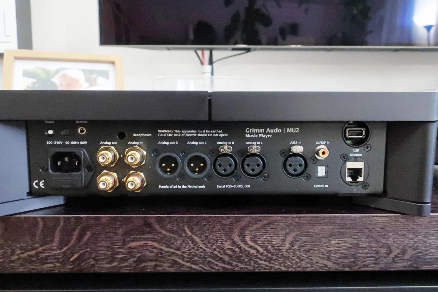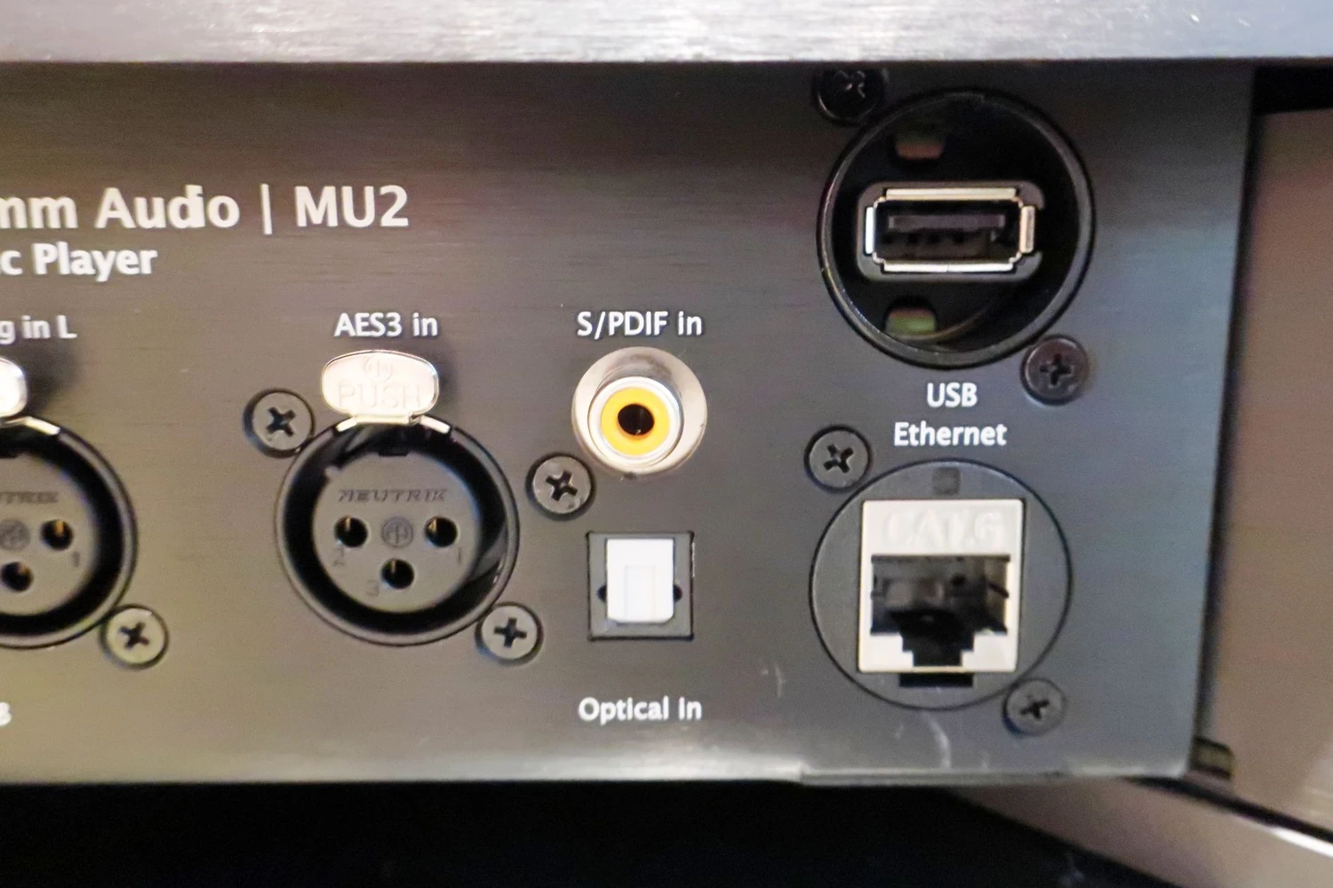 Trois connecteurs (AES, optique, coaxial) représentent le monde numérique classique. Ensuite, vous avez les deux dernières prises – l’une pour connecter des disques USB externes, l’autre pour la connexion Ethernet au réseau.