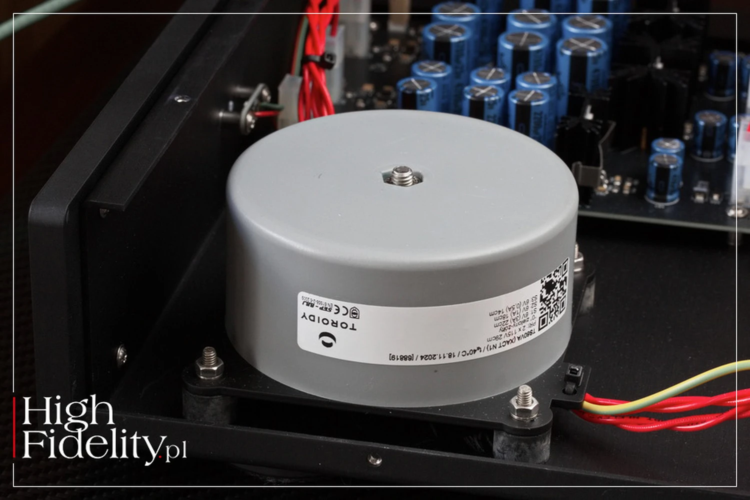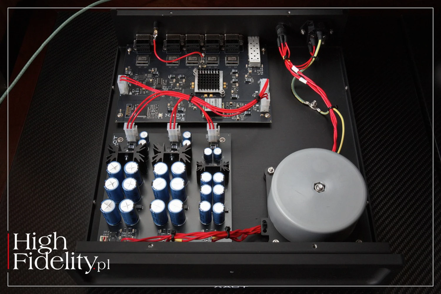Les composants électroniques sont placés sur deux cartes PCB – une avec l’alimentation et une avec le circuit proprement dit. L’alimentation est exceptionnellement complexe et pourrait facilement servir de base à un amplificateur de taille moyenne. Le transformateur provient d’une ENTREPRISE POLONAISE appelée Toroidy.pl, ce qui est un excellent choix, car il vaut mieux utiliser des produits de haute qualité fabriqués aussi près que possible du siège du fabricant audio. Le transformateur est blindé et, autant que je puisse en juger, rempli de résine amortissante des vibrations. Les vibrations sont encore atténuées par des isolateurs perdants sur lesquels repose la carte métallique avec le transformateur.