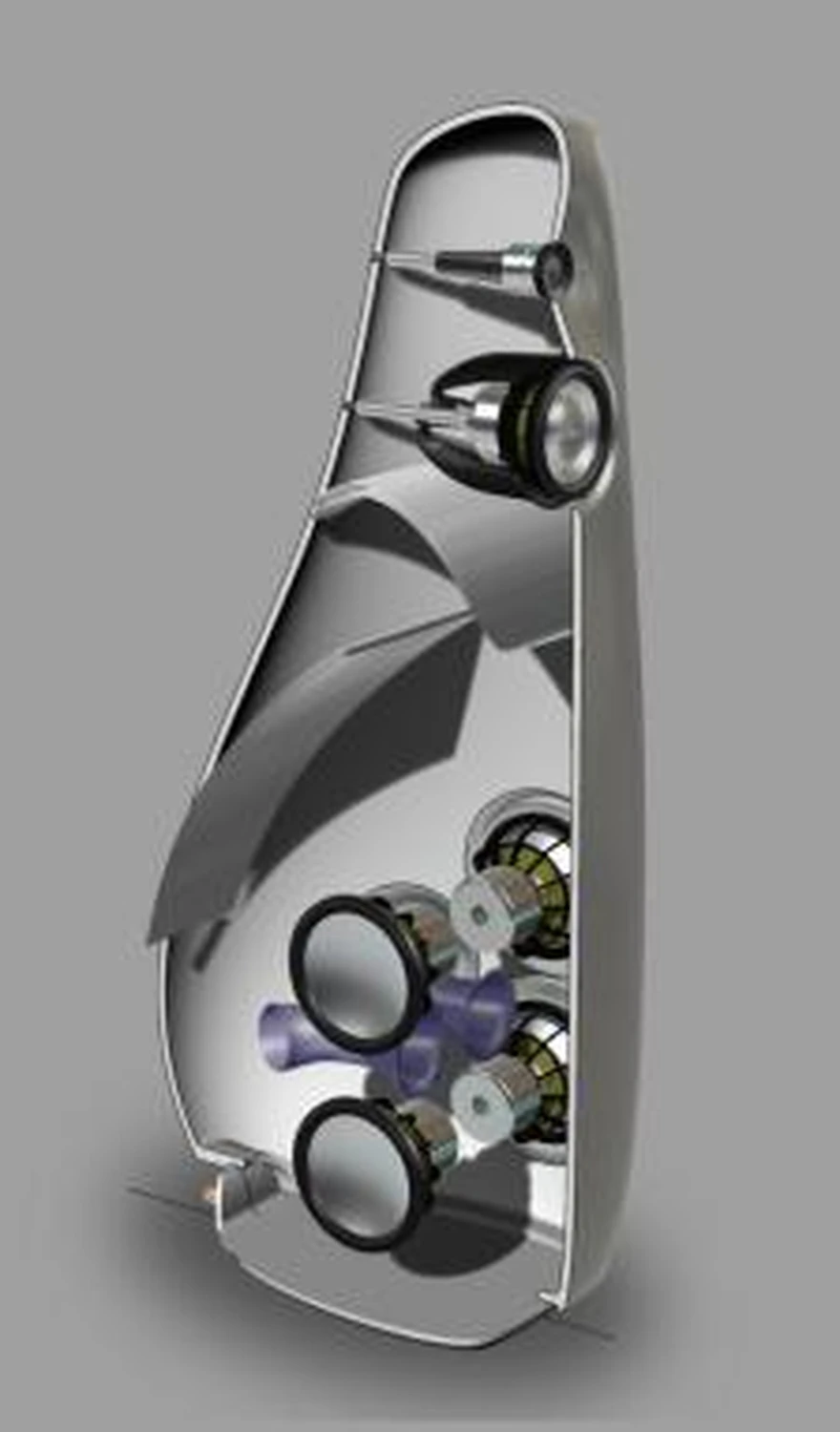 Le Kaya 90 incarne beaucoup de la même philosophie d’ingénierie que le Nautilus et le reste de la gamme Vivid Audio. Bien que le design simplifié du caisson de la gamme Kaya réduise le coût de production, il conserve beaucoup des avantages acoustiques du Giya. Alors que la série Giya peut approcher les 100 000 dollars, le haut de la gamme Kaya est proposé à un prix nettement inférieur de 26 000 dollars. Les caissons de la série Kaya sont construits à partir d’un composite sandwich renforcé de verre et à âme Soric. Soric est un tissu en nid d’abeille conçu pour être utilisé dans des stratifiés. Les trois couches de tissu sont placées dans un moule hermétique, l’air est évacué sous vide, et l’agent de liaison est injecté. Le résultat est un panneau léger et rigide. Les caissons Kaya sont fabriqués à partir de trois panneaux séparés : gauche, droit et façade avant, bien que je n’ai pas pu localiser les joints dans ma paire d’examen. En plus de sa rigidité, la construction composite présente également un autre avantage significatif : malgré les dimensions d’environ 47,3 pouces de hauteur, 14,6 pouces de largeur et 22,3 pouces de profondeur, le Kaya 90 ne pèse que 84 livres. Mon échantillon de test est arrivé dans une finition mate Oyster très attrayante mais discrète. Les autres couleurs standard sont le Piano Black et Pearl, mais presque toutes les demandes de couleur peuvent être satisfaites. Avant de discuter des haut-parleurs et de leur configuration, je veux parler du design des Kaya. J’ai parlé avec le designer Laurence Dickie, qui a clairement indiqué que la forme suit très largement la fonction dans ses conceptions. Au cours de notre conversation, il a été beaucoup question de contrôler l’onde arrière des haut-parleurs et de minimiser le bruit du caisson. En parcourant le site Web de Vivid Audio, vous verrez beaucoup de discussions sur le chargement en basses reflex, le chargement par tube effilé et les trompettes d’absorption des basses courbées, tous liés au contrôle de l’onde arrière des haut-parleurs et à la minimisation des perturbations à l’intérieur du caisson qui pourraient être transmises à travers le diaphragme du haut-parleur.