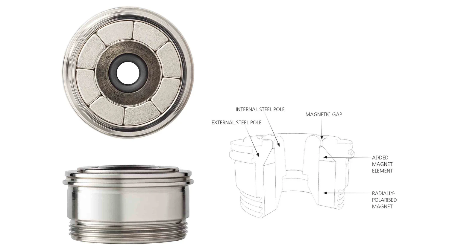 Tous les éléments de haut-parleur ont des membranes en aluminium, et ont leur point de rupture bien au-dessus de la fréquence de coupure. Cela pour la plus faible distorsion possible dans leur gamme de fréquences de fonctionnement. Et comme mentionné, tous les éléments ont chacun leur propre tube rétréci qui absorbe l’énergie provenant de l’arrière de la membrane. Tous les éléments ont leur propre puissant et énorme aimant, pour le meilleur contrôle possible. Les aigus seuls ont une densité de flux de 2,4 teslas, ce qui est extrême – plus du double de ce qui est normal. Tant les éléments que le reste de la création sont fabriqués par Vivid Audio. Cela signifie un contrôle total sur l’ensemble de la construction du haut-parleur. Les aimants sont assez spéciaux, avec une densité de flux extrême. Pour le meilleur contrôle possible. Photo : Vivid Audio
