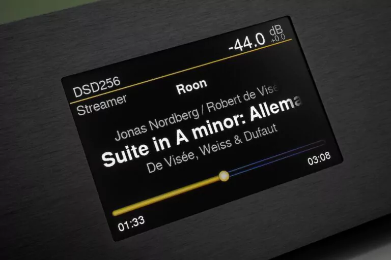 Tout aussi étonnante est la longévité du serveur musical de Grimm Audio. En général, les appareils avec une grande plage dynamique, une bonne transparence et une immense richesse de détails conduisent rapidement à la fatigue auditive. Notre cerveau a souvent du mal à traiter autant d’impressions différentes. Ce n’est pas vraiment le cas avec le MU2. Au lieu de bombarder l’auditeur de toutes les petites choses, il les présente plutôt de manière assez détendue. Cela dépend de chacun de décider dans quelle mesure il souhaite plonger dans l’expérience. Plongerez-vous complètement dans l’action, absorbant les harmoniques fines des cordes et des percussions, appréciant la basse puissante et les voix claires ? Ou vous laisserez-vous envelopper par l’arrangement, suivant le bon flot de la musique, la belle plasticité et la naturalité que le MU2 tire des enregistrements. Le changement peut même se faire en vol, et le serveur sonne toujours clair, spacieux et d’une manière qui semble juste à tout moment. L’écran à l’avant donne des informations sur le titre en cours de lecture, le volume et le taux d’échantillonnage. Pour que cela fonctionne, le plug-in Grimm Audio doit être activé une fois.
