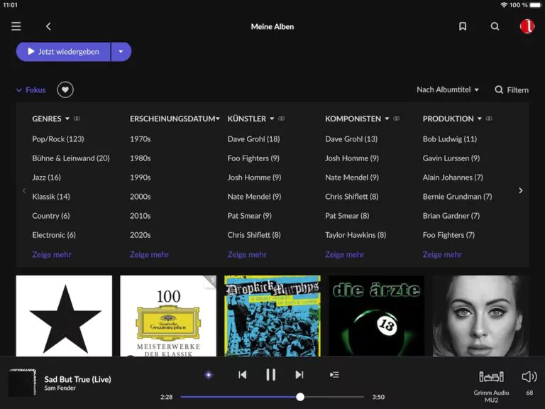 Sous l’onglet “Extensions”, le plug-in Grimm Audio doit également être activé lors du premier démarrage pour que l’écran de l’appareil affiche les bonnes informations. Une fois cela fait, on peut commencer. Le choix de Grimm pour le programme de musique se révèle immédiatement être le bon. Les énormes possibilités, combinées à un confort d’utilisation très élevé du programme, créent une expérience utilisateur que aucune autre application de streaming n’offre jusqu’à présent. La bibliothèque peut être organisée et parcourue de diverses manières. Même des paramètres souvent négligés tels que le format de fichier ou le label peuvent être utilisés comme filtres dans la fonction “Focus”. La plupart des artistes et albums sont accompagnés d’informations détaillées, de critiques et de liens croisés. L’algorithme propre à roon s’améliore également avec l’utilisation, ce qui concerne la création de listes de lecture et les suggestions de titres. Il est cependant recommandé de coupler le programme à au moins un service de streaming tel que Qobuz ou Tidal pour profiter pleinement de toutes les fonctionnalités. Avec la fonction “Focus”, la bibliothèque peut être filtrée selon divers critères. La recherche de mots fonctionne également très bien avec roon et relie les contenus locaux et en ligne.
