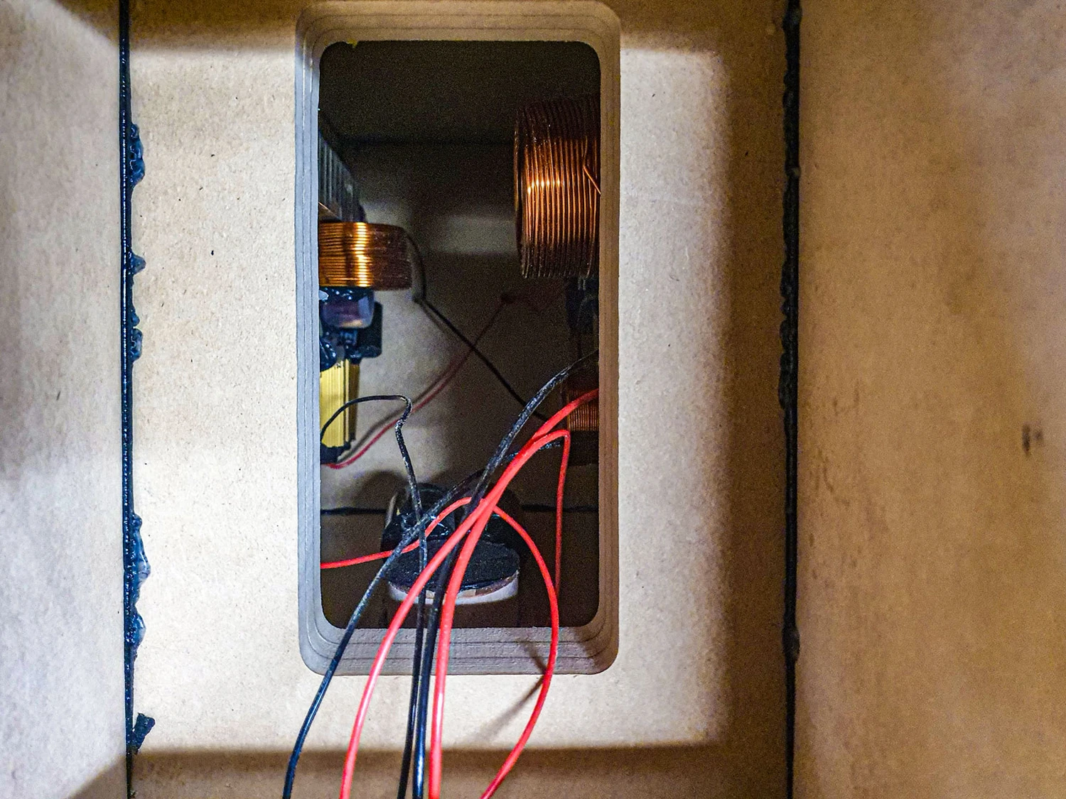 Même les entretoises sont multilaminées. En dessous se trouve le filtre en deux parties, qui est équipé exclusivement des meilleurs composants (Photo : Peak Consult). Une fois le filtre installé, la chambre est complètement remplie de sable fin puis scellée. Le sable supprime efficacement toutes les vibrations des composants (Photo : Peak Consult). Le filtre sépare le woofer et le tweeter à 2 500 hertz avec 12 dB par octave. Pour les filtres, Fink utilise le meilleur des spécialistes Mundorf, Jantzen et Duelund – complexe, mais attendu. Cependant, la linéarisation de l’impédance au-dessus de 100 Hertz est particulièrement impressionnante. Rarement ai-je vu une courbe d’impédance, de phase et d’EPDR aussi lisse.