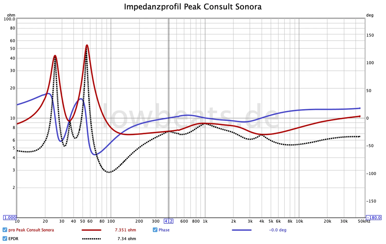 La mesure LOWBEATS semble tout droit sortie du manuel : l’impédance et la phase sont linéaires et pratiquement sans décalage. Ce type de comportement facilite particulièrement la tâche de l’amplificateur connecté. Maintenant, personne ne penserait à combiner un amplificateur à 1 000 euros comme le Cambridge CX 61 avec ce transducteur à 25 000 euros. Mais cela est possible car la Sonora est complètement peu exigeante en termes de puissance et parce qu’elle est déjà complètement exploitée avec un bon 100 watts. Cela est principalement dû à l’accord bas – il reste très peu d’efficacité. 83 dB (à 2,83 volts/mètre) ont été mesurés par le laboratoire. C’est relativement inefficace pour un haut-parleur moderne et, au final, cela conduit à un niveau maximum plutôt bas et à une capacité de gestion de puissance pas particulièrement élevée. Comme je l’ai dit : 100 watts par canal sont en fait tout à fait suffisants, car plus que cela pourrait rapidement surcharger le délicat haut-parleur sur pied. Mais il faut toujours garder à l’esprit : la Sonora est en fait un haut-parleur compact cultivé et aigu. Si vous voulez remplir de grandes salles avec un son dynamique, il vaut mieux chercher ailleurs…
