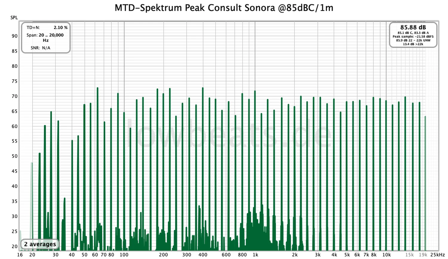 La mesure classique du salon à 85 dB révèle de mineures distorsions dans toute la plage basse-moyenne. Vous pouvez également voir l’énorme équilibre (mesure : J. Schröder). À des niveaux plus élevés, la distorsion a augmenté dans l’ensemble. Et à un niveau continu de 95 dB, cela marquait la fin (mesure : J. Schröder).