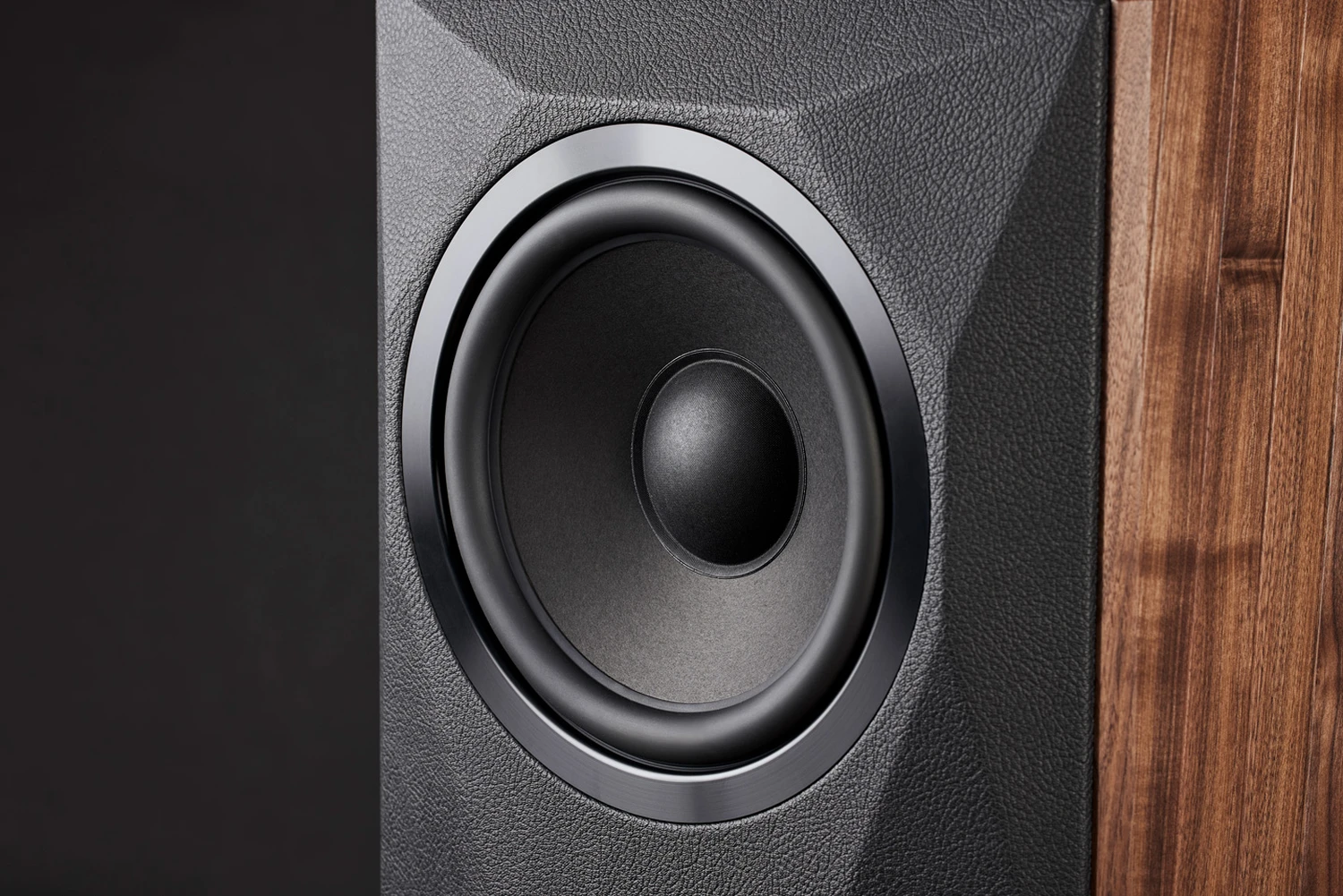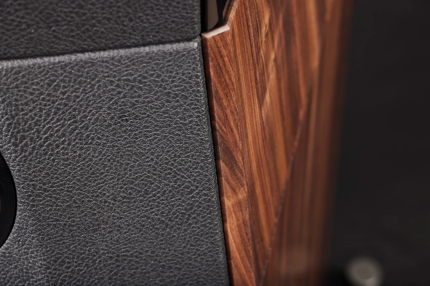 Les pilotes sont fraisés dans le baffle recouvert avec une précision absolue. L’avant incliné est couvert de cuir synthétique noir, derrière lequel se cache un baffle pouvant atteindre six centimètres d’épaisseur. De généreux chanfreins sur les côtés du baffle réduisent les réflexions, tandis que les différentes distances entre les modules de woofer, de médium et de tweeter garantissent un comportement de phase optimal – les signaux des différents pilotes doivent atteindre l’oreille de l’auditeur en même temps – afin que les impulsions et la spatialité soient reproduites de la meilleure manière possible. Et tout cela est réalisé de manière impeccable et fabriqué d’une manière rarement vue. Rien que toucher le travail est un grand plaisir.