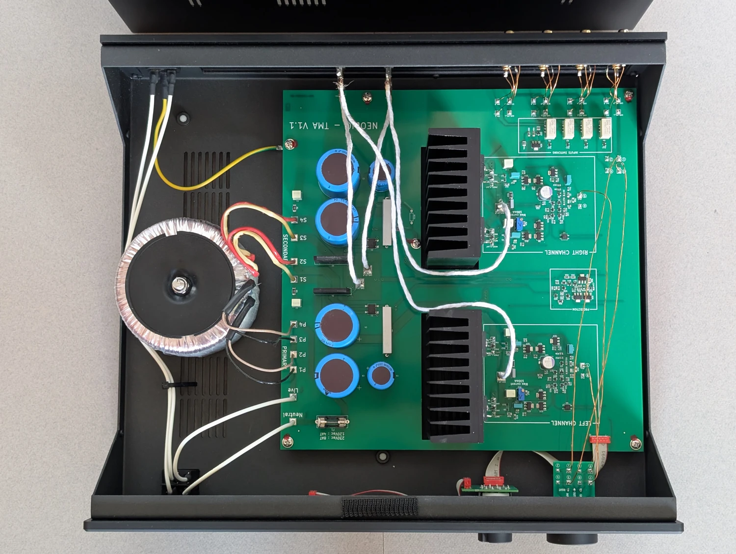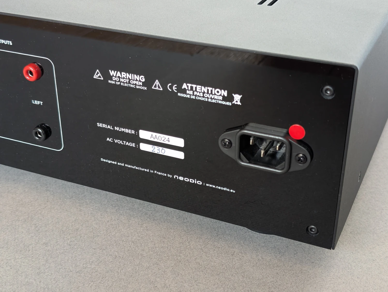 Le minimalisme extérieur du Neodio TMA est le reflet de ce qu’il y a sous son capot. Le châssis de l’appareil est composé de tôles pliées de bonne épaisseur avec un panneau arrière non-conducteur en plexiglas. Stéphane Even, le concepteur des produits Neodio, applique la philosophie audiophile du “fil droit avec du gain”. L’architecture intérieure du TMA est particulièrement bien ordonnée, utilisant un minimum de composants. Elle s’appuie sur un circuit imprimé principal en verre époxy, de haute qualité. Ce circuit est réalisé en France, tout comme l’assemblage. L’alimentation est assurée par un transformateur toroïdal de 300 VA Torivac fabriqué en Espagne. Ce transformateur est suivi de quatre capacités principales de filtrage de marque Vishay (10 000 µF sous 63 V chacune).