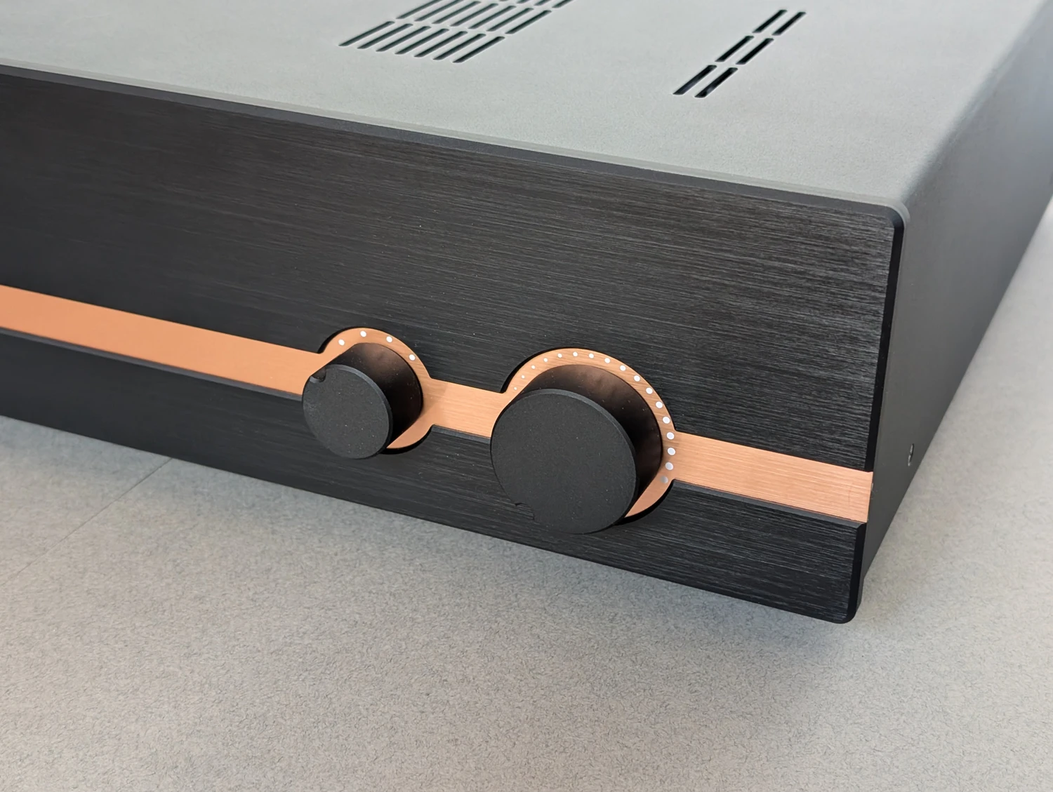 Le Neodio TMA, pour “The Minimalist Amplifier”, porte bien son nom. On aura rarement rencontré d’intégré stéréo aussi minimaliste sur la forme et sur les fonctions. L’appareil n’est certes pas dénué d’élégance avec son épaisse façade noire en aluminium brossé rehaussée par un bandeau cuivré. Cependant, ses commandes et équipements ne peuvent être plus simples. L’avant du Neodio TMA n’accueille ainsi qu’un potentiomètre de volume et un sélecteur de source rotatif. L’interrupteur est situé sous la tranche du côté gauche. À l’arrière, la connectique se limite à quatre paires de prises RCA pour les quatre entrées analogiques de niveau Ligne et à des borniers pour une seule paire d’enceintes qui n’acceptent que les fiches banane. Ici pas d’étage de préampli phono, ni de DAC intégré et encore moins de streamer.
