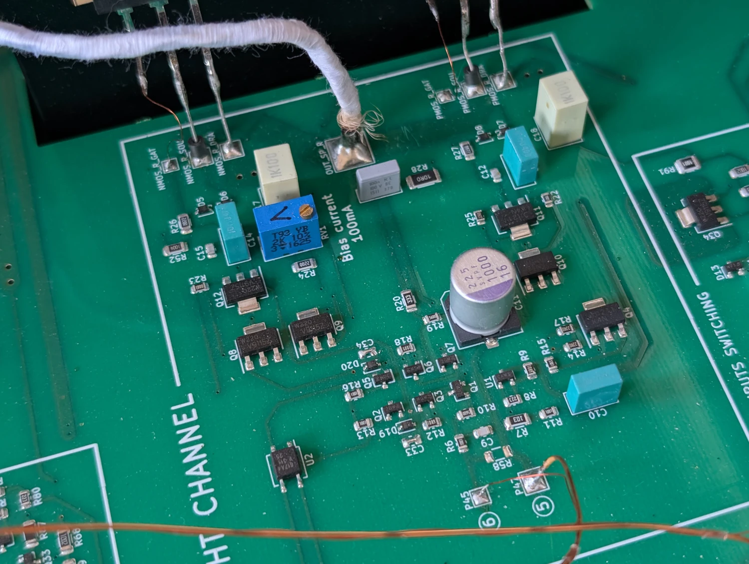 Les étages de préamplification sont en composants discrets. Ceux d’amplification fonctionnent en configuration simple push-pull, avec un fort taux de contre-réaction, à partir de transistors Mosfet (modèles Exicon ECW20N20 et ECW20P20). Chaque voie dispose de son propre radiateur de dissipation thermique en aluminium massif. On remarque le soin apporté au câblage, avec des conducteurs gainés de textile pour les sorties haut-parleurs et des fils de Litz pour les autres liaisons. Notons que, du fait de sa configuration très simple et épurée, le TMA sera facile à réparer en cas de panne. Ce qui ne l’empêche pas de disposer d’un circuit de protection contre les surcharges.