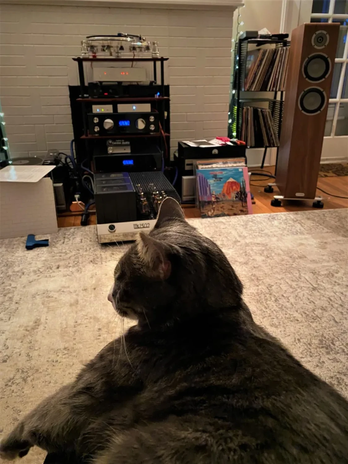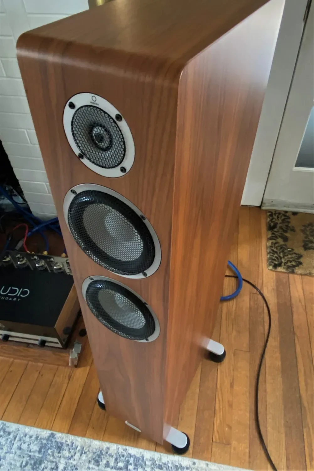 J’ai installé les Trios à peu près au même endroit éprouvé où la plupart des enceintes se retrouvent dans ma pièce : 42 pouces du baffle avant au mur derrière. Ils sont livrés avec des petits disques ronds à placer sous les pieds coniques en dessous des pieds métalliques. J’ai effectué des ajustements subtils lors de l’installation, mais contrairement à certaines enceintes que j’ai testées, il n’y avait pas ce « Point Unique » où tout se verrouille. Peut-être que le port orienté vers le bas a quelque chose à voir avec cela – qui sait ? L’angle d’inclinaison était à ma convenance selon le manuel Marten. À moins que les enceintes ne soient conçues pour sonner mieux avec peu ou pas d’inclinaison (comme l’Acora SRC-2), je gravite généralement vers une présentation plus focalisée qui se produit avec juste un peu moins d’angle qu’un alignement direct avec mon point d’écoute. C’est à peu près là où les Oscar Trios se sont retrouvés. L’équipement associé était le suivant : Rega Research P10 avec la cartouche Charisma Audio Signature One ou Vertere MG-1 avec la cartouche Vertere Mystic MC, VAC Master Preamplifier avec étage phono intégré, principalement un amplificateur de puissance McIntosh MC 1502 avec un usage occasionnel d’une paire de Pass Labs XA-60.8 monoblocs ou Audio Hungary Qualiton APX-200 Mk II. J’ai joué des sources numériques via Roon et Qobuz à partir d’un Innuos Zen Mini alimentant un Denafrips Pontus DAC. Tous les câbles étaient les exceptionnels Cardas Audio Clear Light et une Cardas Power Bar avec des cordons d’alimentation associés.