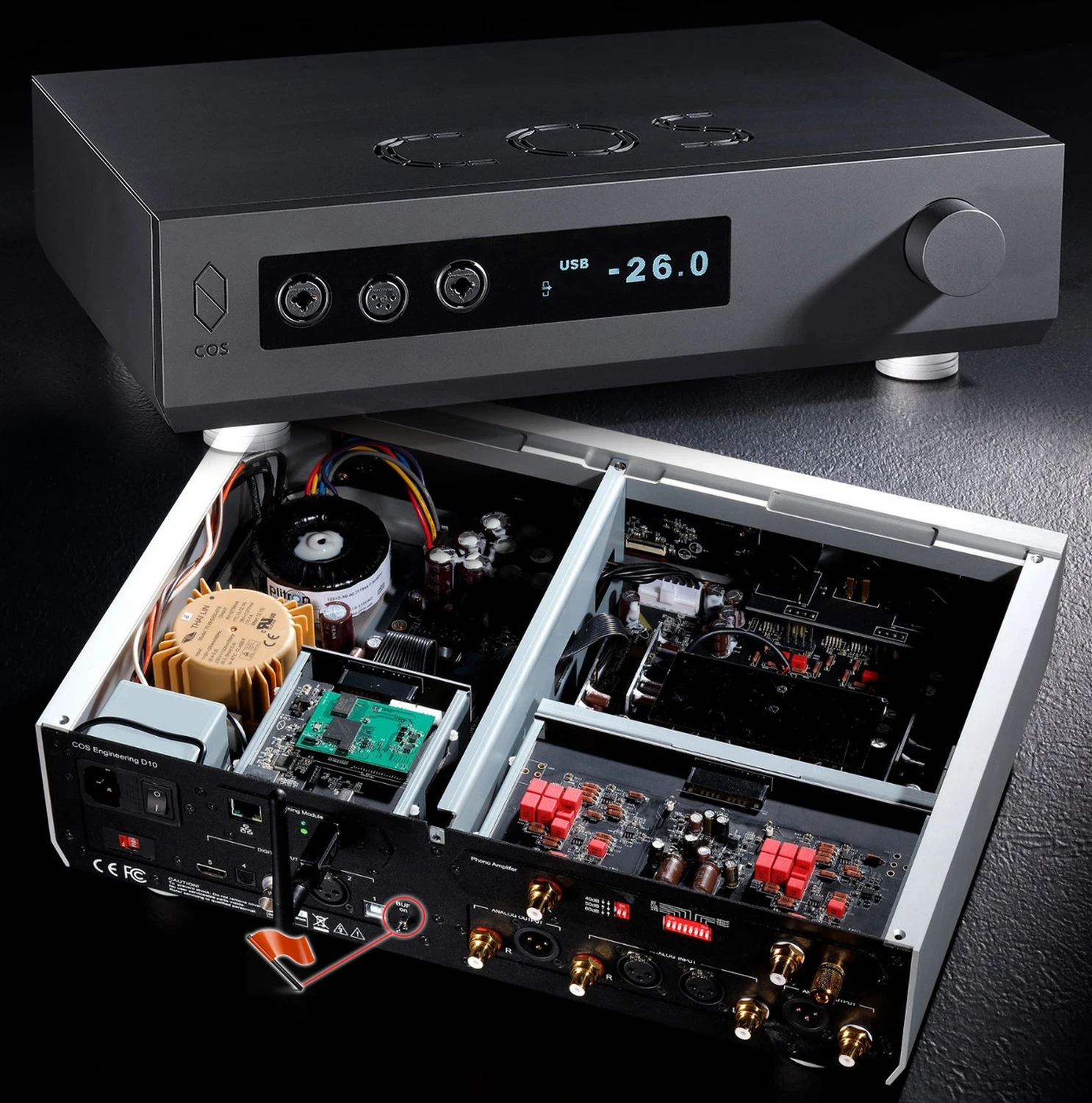 Dans ce contexte musicalement significatif, oser revisiter le COS D10 dans sa nouvelle version v2 est une autre affaire de secondes noces. Après tout, j’ai REVUE l’original en novembre 2020. Je lui ai même attribué une note. Que faire après cela ? Peut-être se rendre dans un Bayreuth virtuel – bien que pas pour entendre une grosse dame chanter. En réalité, v2 ne signifie pas juste un redémarrage saisonnier. Cela signifie progrès. « Les changements majeurs comprennent un nouvel oscillateur de jitter sub 0,1 ps pour le convertisseur, donc d’une pleine magnitude supérieure ; un régulateur amélioré et des condensateurs de bypass pour cet oscillateur ; un TXCO à faible jitter également pour le module de streaming ; et un nouveau transformateur d’alimentation pour le circuit analogique. Cela prend en charge 110VAC jusqu’à 240VAC, donc gaspille moins d’énergie, crée moins de stress/chaleur avec un noyau en fer plus efficace, des bobines plus épaisses et une topologie de bobinage spéciale pour réduire encore le bruit émis. Nous jouons presque entièrement de la musique via le streaming dans notre bureau maintenant. Il était donc essentiel d’améliorer davantage le son pour le streaming de plusieurs manières. Cela inclut un switch Ethernet dédié alimenté par une alimentation linéaire. Mais plus sur ces éléments plus tard dans l’année. » Pas de repos pour les méchants alors ; du côté de la fabrication _et_ de la révision.