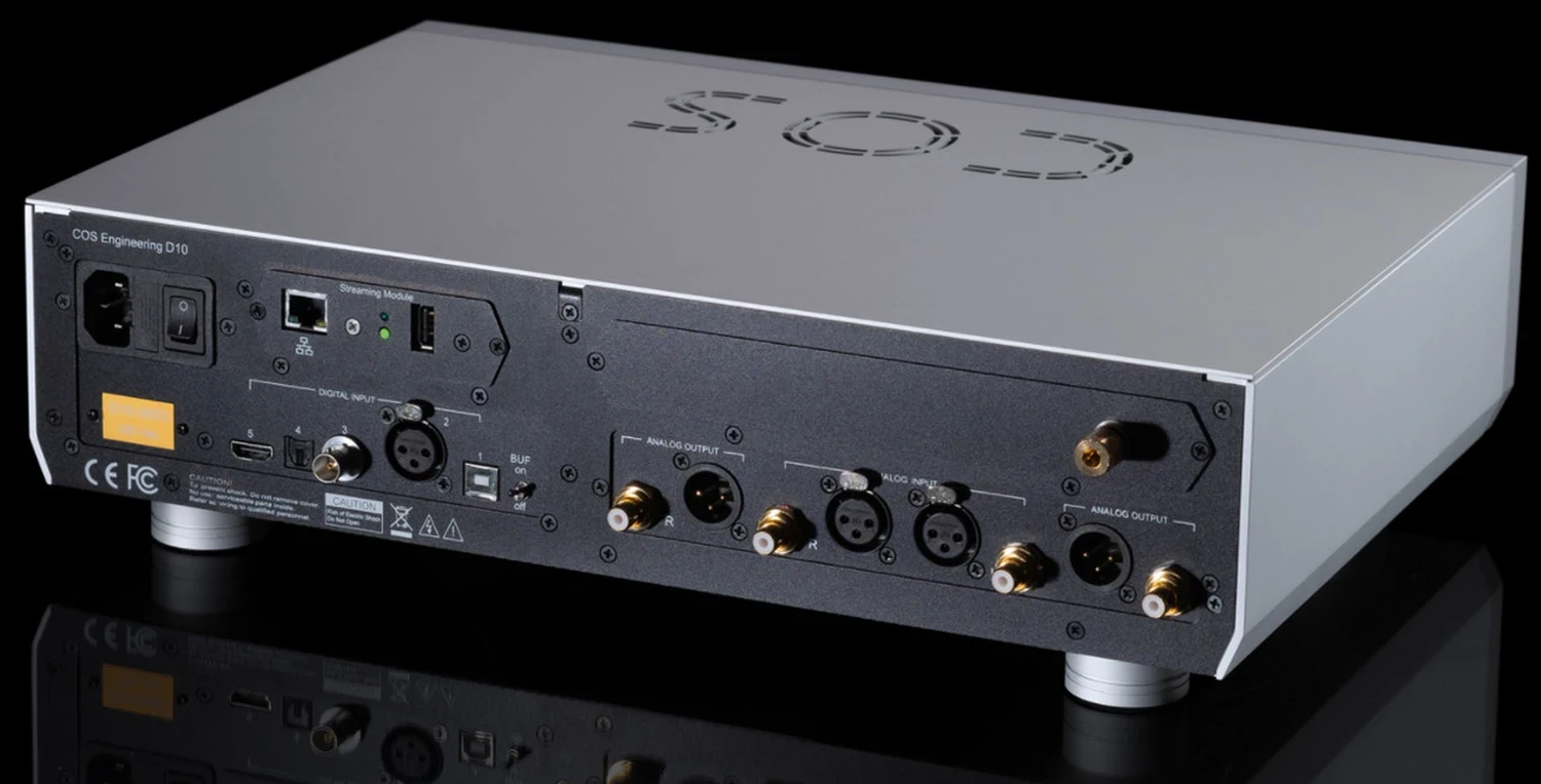 _PENSEZ À L’INTERRUPTEUR DE BUFFER. ‘OFF’ DÉFAIT LE MISE EN CACHE/RECONSTRUCTION INTERNE POUR UN SYNCHRONISME PARFAIT. ‘ON’ AURA UN MEILLEUR SON LORSQUE UNE LATENCE D’UNE SECONDE N’EST PAS UN PROBLÈME._ LE COÛT TOUJOURS MOINS ÉLEVÉ DE LA MULTIPLICATION. ♦ Préampli analogique avec entrées XLR/RCA. ♦ DAC BurrBrown 24/192 à double différence entièrement équipé. ♦ Amplificateur pour casque. ♦ Streamer avec MQA. ♦ Étape phono. Avec ces deux dernières fonctionnalités sur des cartes modulaires optionnelles, le D10 v2 peut être configuré en 3-en-1, 4-en-1 ou même 5-en-1. Chaque fonction ajoutée élimine une boîte supplémentaire et les coûts associés, y compris plus de câbles de signal/power et d’espace sur l’étagère. Plus nous empilons notre COS, plus nous économisons. Mon propre empilement manque de phono et de streaming, donc je ne ferai aucun commentaire à ce sujet. Là où je streame de la musique basée sur le cloud, je le fais via PC/Mac sur un pont USB externe vers un écran de 27 ou 34 pouces, plus un clavier/souris filaire. Le WiFi est désactivé mais Bandcamp, Qobuz, Spotify, Tidal et YouTube sont tous accessibles via leurs fenêtres de navigateur. J.River sur ma station de travail Win10/64 et Audirvana 3.5 sur mon iMac musical sont les lecteurs logiciels. Pour cela, tout DAC sans USB suffit puisque mes ponts USB sortent un coaxial re-clocké, BNC, AES/EBU, même I²S via HDMI/RJ45. Donc je n’ai pas besoin de streamers. Et oui, cela me place dans la minorité extrême. Je suis simplement trop ancré dans cette manière de faire pour changer maintenant lorsque l’allergie WiFi de notre maison est résolument contre les streamers sans tête qui dépendent des tablettes ou des smartphones WiFi pour fonctionner. Tout le monde peut joyeusement ajouter le module streamer de COS à 900 € et/ou ajouter la phonification complète pour 700 €. Ce dont je vais parler, c’est du D10 v2 en tant que standard 3-en-1. Si vous êtes un 5 complet, la REVUE de Christiaan Punter sur la v1 vous couvre très bien déjà.