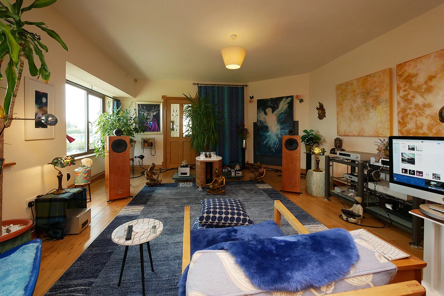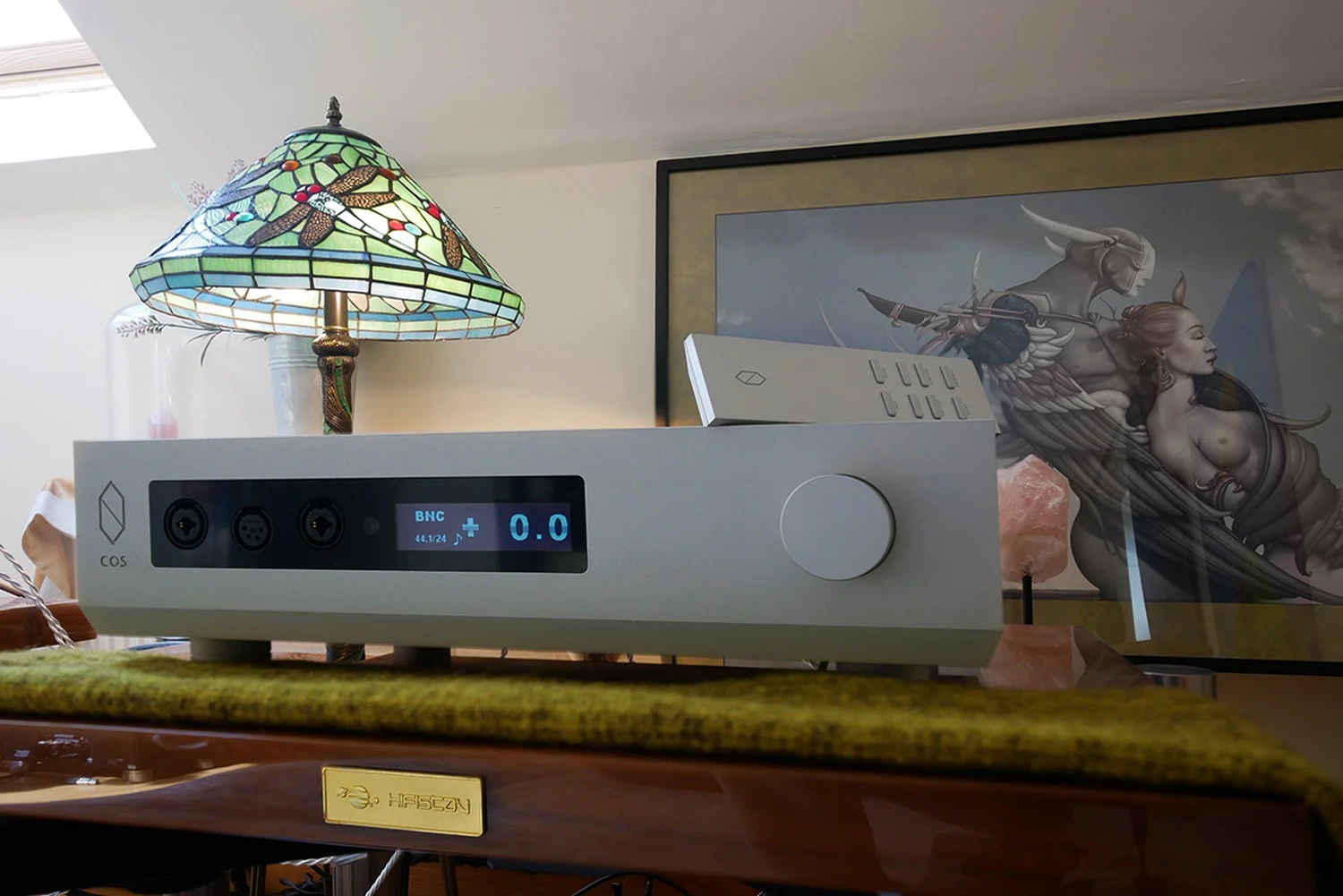 UUH. AAH. Discussions sous les draps. Pour voir toute l’action des araignées, j’ai retiré la plaque en plexi au-dessus des puces convertisseurs BB. Utilisez la fonction loupe de la souris pour agrandir. Voici la moitié gauche du châssis ouvert. Voici la moitié droite clôturée. En dehors de l’alimentation, elle montre le module de streaming optionnel. Ce n’est PAS l’un de ces amplificateurs de classe D à moitié vides dans un châssis surdimensionné, même sans le module phono encore manquant. Ce remplissage est assez bien rempli malgré tout. Les amateurs de substance seront satisfaits. Couvercle remis en place. Trois petites vis plus tard, c’est fait. Jours heureux ? Virtuellement instantanément. Mon préampli passif auto-transformateur sur mesure de Pál Nagy inclut un filtre hi/low-pass de 4ème ordre à 40 Hz pour séparer les moniteurs Vox 3awf de sound|kaos et le caisson de basses Dynaudio de 2×9,5 pouces. Donc j’ai réglé le v2 à 0,00 volume. Dès que mon transporteur de carte SD Soundaware D100Pro a démarré, la petite note musicale pour le verrouillage du signal est apparue dans la fenêtre COS. J’avais du son, donc je suis parti avec le transport réglé pour passer en boucle à travers une liste de lecture de 200 morceaux. Les choses allaient mijoter un peu. En utilisation, les hiboux de nuit et d’autres qui travaillent mieux dans l’obscurité pourraient préférer que les quatre options de luminosité de l’affichage incluent l’extinction. Même à son niveau le plus faible ci-dessus, c’est encore assez lumineux lorsque d’autres sources lumineuses sont éteintes. Peut-être que COS peut réécrire le firmware pour ajouter l’extinction de l’affichage, sauf pour son point décimal ? Ensuite, ils pourraient également laisser ce point allumé pour le mode veille. L’affichage éteint reviendrait à l’allumé pendant quelques secondes chaque fois que l’utilisateur changeait un paramètre par télécommande ou bouton. En l’état, l’affichage éteint équivaut à veille, l’affichage allumé signifie mise sous tension avec divers degrés de luminosité. Je préfère les indicateurs visuels minimalistes. Je désactive toujours les affichages quand c’est une option. Ne pas l’avoir ici est ma seule critique fonctionnelle. Maintenant, il était temps de se battre contre le Denafrips Terminator Plus, d’abord en mode standard puis avec synchronisation d’horloge ajoutée via le transport.