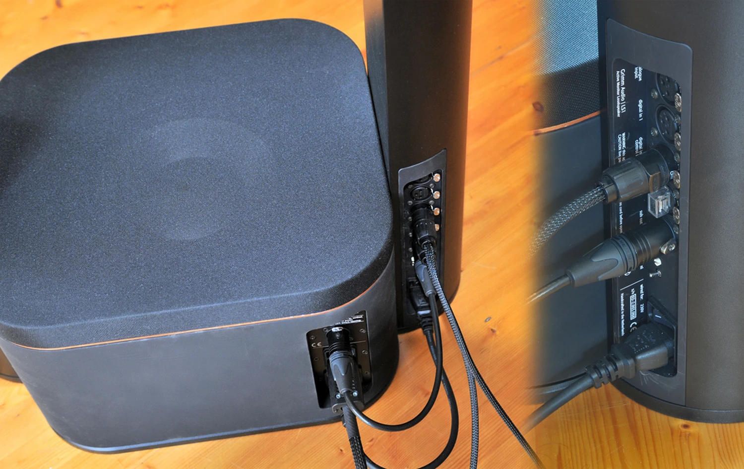 Nous passons maintenant de la théorie à la pratique lorsqu’un après-midi ensoleillé, Guido Tent a arrêté sa voiture devant notre maison et a commencé à décharger nos haut-parleurs LS1be en prêt. Pas de boîtes en carton ou de kit d’assemblage, cette fois-ci nous avions des haut-parleurs entièrement assemblés dans des coffres de transport robustes. Pour faciliter le transport, les lourds subwoofers avaient leurs propres caisses. Une fois déballés, Guido a rapidement pris un haut-parleur sous le bras et est monté les escaliers. Cela devait lui être très familier et la forme en H en faisait un mouvement naturel. Après avoir placé les subs sur les plaques de pieds des LS1be, il était temps de procéder au câblage. Deux câbles d’alimentation fournissaient le courant aux prises d’alimentation IEC de chaque haut-parleur. En dessous de ces prises se trouve une sortie d’alimentation d’où un court câble alimente le subwoofer.