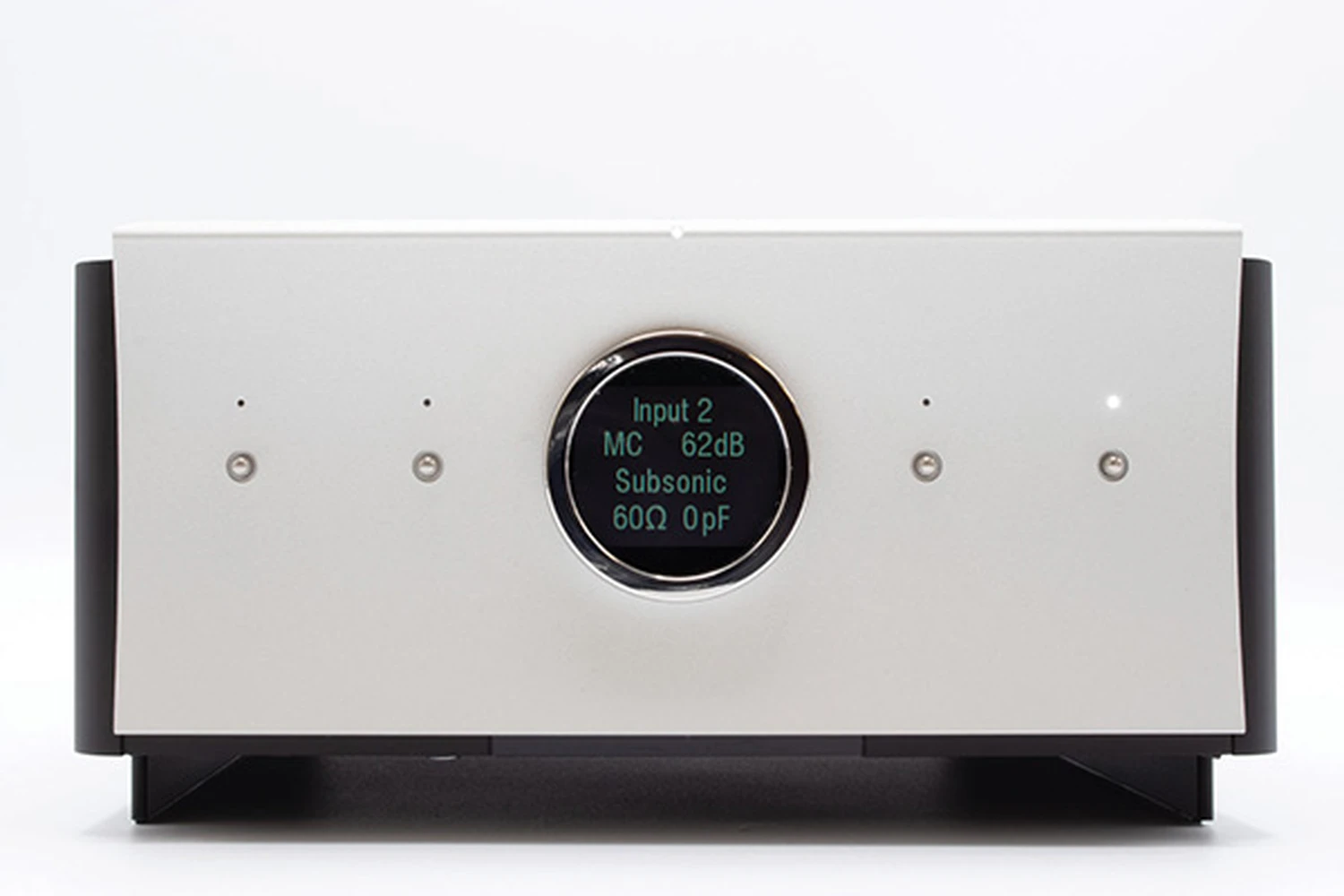 Logé dans le même châssis demi-largeur en forme de boîte à chaussures que le Tambaqui, le Lupe partage également le couvercle supérieur en forme d’onde sinusoïdale sculptée du Tambaqui, un peu une signature de design de Mola Mola. La société dit que les courbes aident à prévenir les résonances du châssis. Elles découragent également l’empilement – probablement une bonne chose compte tenu de la grande sensibilité des circuits de gain phono aux interférences électriques provenant des composants voisins. Le panneau avant est également incurvé et comporte quatre minuscules boutons-poussoirs correspondant aux quatre préréglages du Lupe, et un affichage OLED circulaire indiquant l’entrée et la configuration actuelles.