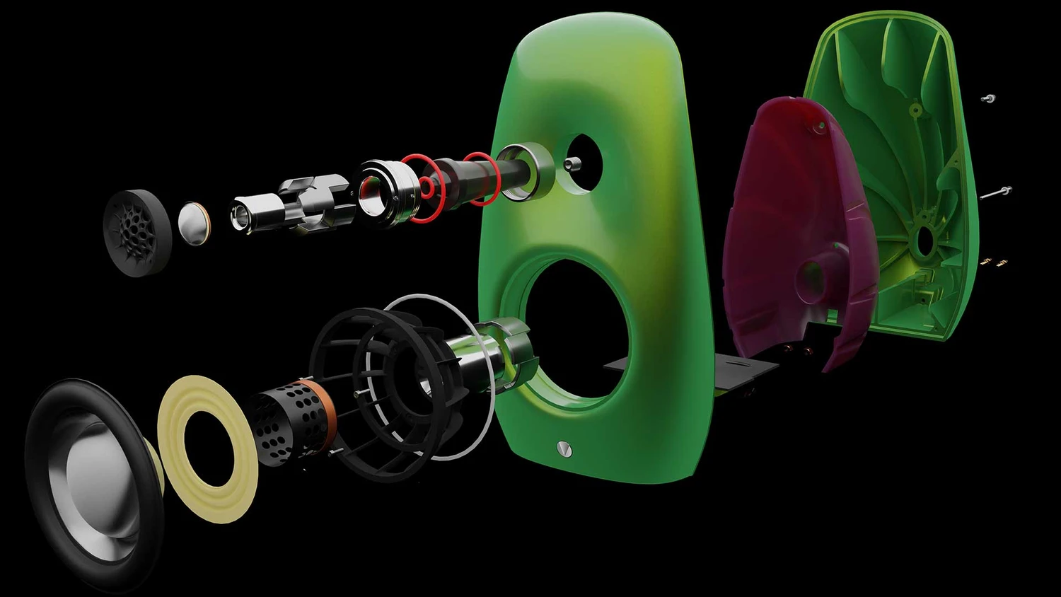 Comme tous les autres haut-parleurs Vivid Audio, le Kaya S12 utilise le tweeter en alliage d’aluminium anodisé D26 de l’entreprise, cette fois associé à un design de tweeter innovant. (Crédit d’image : Avation/JF) Le dôme est monté sur une bobine acoustique en aluminium à bord enroulé, entraînée par huit aimants en néodyme fer boron polarisés radialement. Selon Vivid Audio, la densité de flux magnétique dans l’espace de la bobine qui en résulte est si puissante (2,4 tesla) qu’il n’a pas pu utiliser de ferrofluide ordinaire, et la société Ferrotec Corp (États-Unis) a été commissionnée pour formuler une recette spéciale spécifiquement pour le D26. Et derrière le tweeter, caché dans le cabinet, se trouve ce tube à section exponentiellement conique amorti par fibre qui, selon Laurence Dickie : “a une performance acoustique identique à celle d’un enclos idéal, étant complètement libre de résonance ou de réflexion.” Le tweeter se croise à 300 Hz avec l’unité de médium-basse, désignée ‘C100L’, une unité à cône en alliage de 100 mm avec un capuchon de poussière notablement bulbique, encore une fois une forme inhabituelle qui apparemment repousse la fréquence de rupture du cône hors bande en augmentant la plage de fréquence sur laquelle le cône (et le capuchon de poussière) se déplacent de manière pistons. Vivid Audio affirme que la plupart des fabricants utilisent un capuchon de poussière simplement pour éloigner la poussière de la bobine acoustique ou comme moyen de renforcer la sortie haute fréquence après que le cône principal soit entré dans sa zone de rupture. Et malgré le cabinet relativement petit du S12, le médium-grave bénéficie toujours d’une forme de chargement à tube conique exponentiellement. En effet, il a été découvert que cela devait s’attaquer non seulement aux résonances habituelles de haut en bas du cabinet, mais aussi, dans ce modèle à deux voies plus petit, aux résonances horizontales. Dickie a expérimenté avec un dodécaèdre de tubes en 3D, puis une version repliée en boule, mais il a finalement utilisé l’intérieur de l’enclos lui-même, avec un revêtement intérieur (en marron ci-dessus) s’asseyant à l’intérieur du moulage interne (vert), avec une série de nervures latérales formant ensuite les canaux de l’absorbeur, un agencement que Vivid a appelé un absorbeur Omni Axis. La carte de croisement se trouve en bas, et offre une seule paire de prises plaquées or compatibles avec des bananes juste en dessous du petit port arrière, ce qui rend les connexions à fils nus un peu délicates, bien que pas autant qu’avec les modèles Kaya plus grands, en partie parce que le S12 est plus facile à déplacer, étant assez léger (seulement 6 kg chacun). Le poids minimal est quelque chose qui nous rendrait également moins inquiets d’essayer leur autre option de montage, un support mural élégant (et bien sûr incurvé).