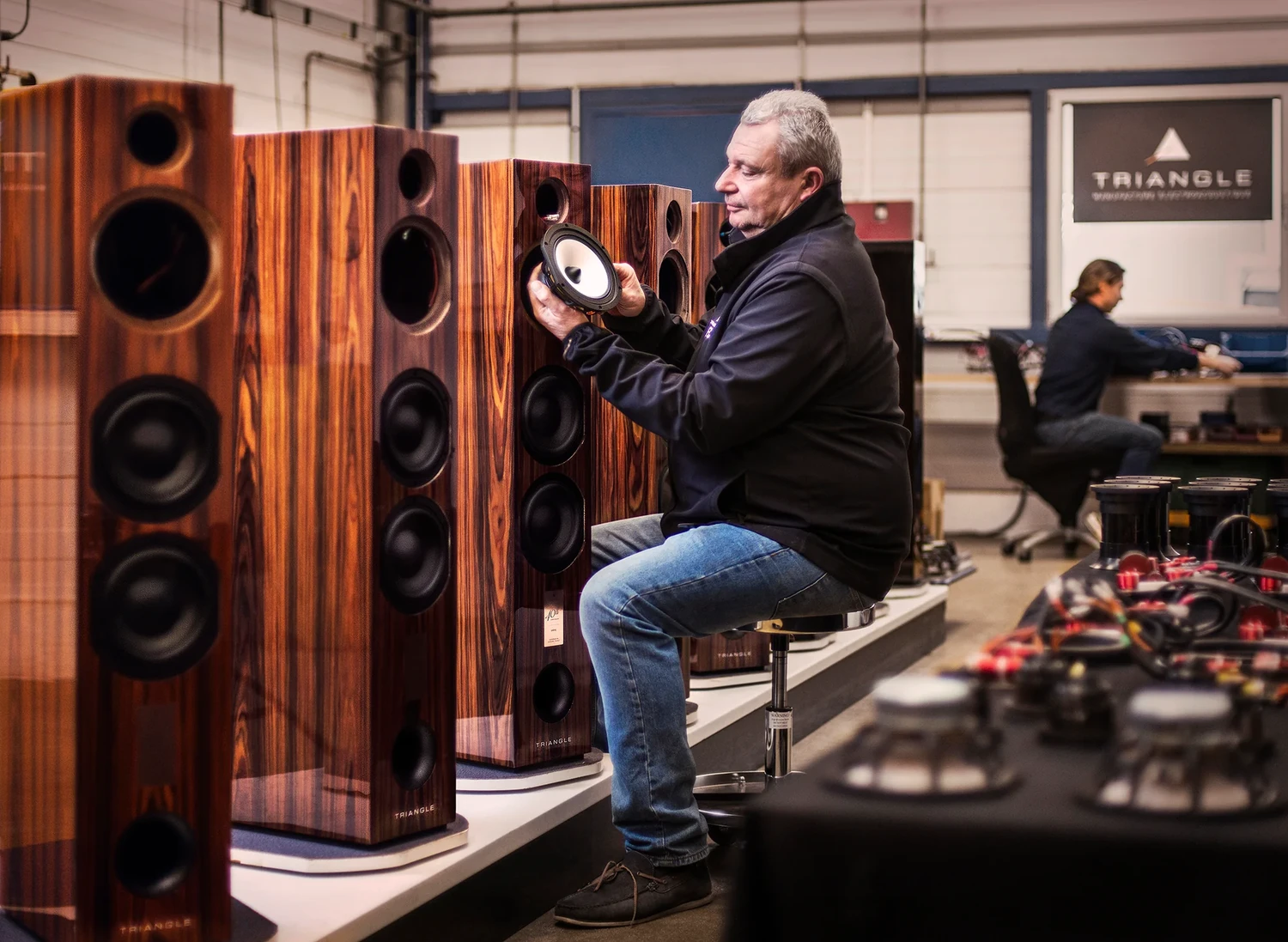 Chaque enceinte Triangle est conçue dans l’atelier de Soissons où la marque assume ses choix de matériaux, de fabrication, et de finition. La politique de fabrication précise que « From the loudspeaker to the cabinetry and crossover, every element of our loudspeakers is designed by our teams ».
