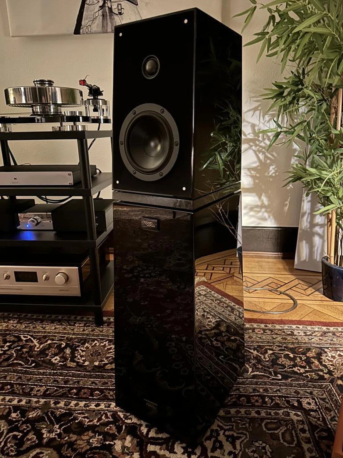 Le positionnement s’effectue classiquement avec un léger pincement ; l’orientation du module grave et la distance au mur arrière permettent d’affiner l’équilibre. Une électronique transparente et tenue (à tubes ou à transistors) mettra en valeur la dynamique sereine et la cohérence temporelle propres à la marque. Supports rigides, câblage sobre et alimentation secteur soignée complètent l’ensemble.