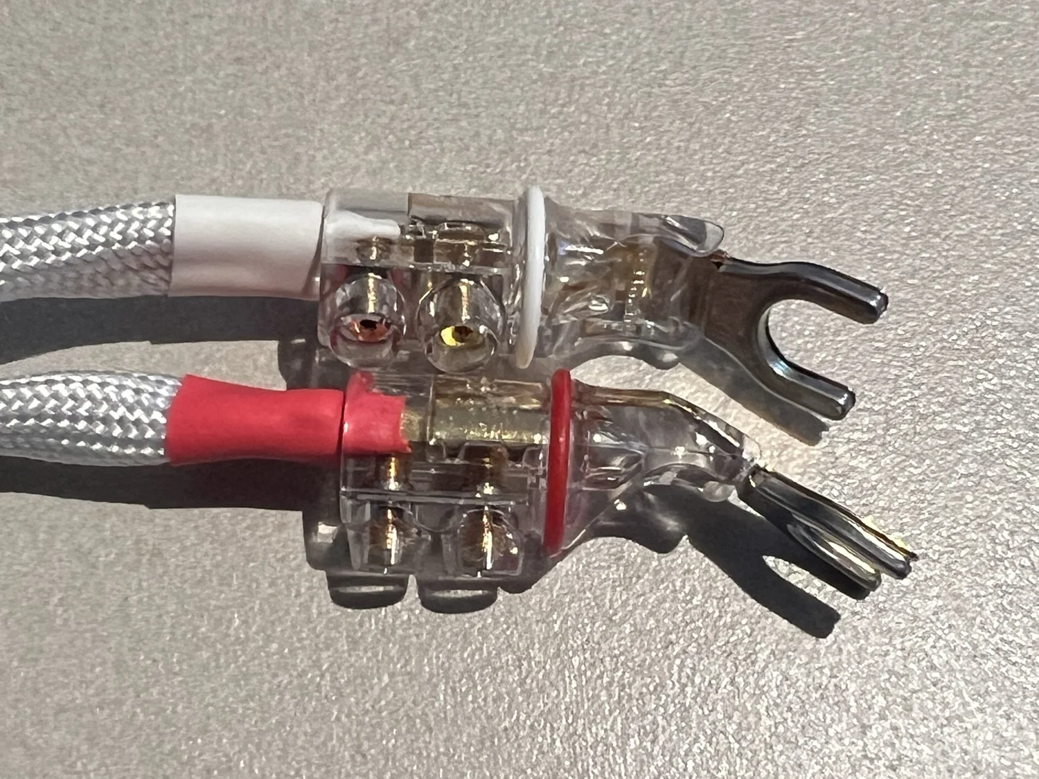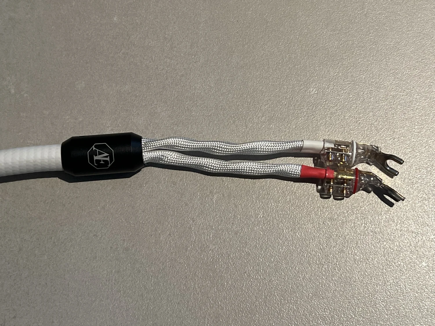 Câbles haut-parleur très haut de gamme, diamètre 15mm, blindés par la technologie Ferroguard™ déposée par AEQUO AUDIO, fourches WBT 8mm à chaque extrémité qui peuvent être remplacés sur demande par des fourche 6mm ou des connecteurs bananes.