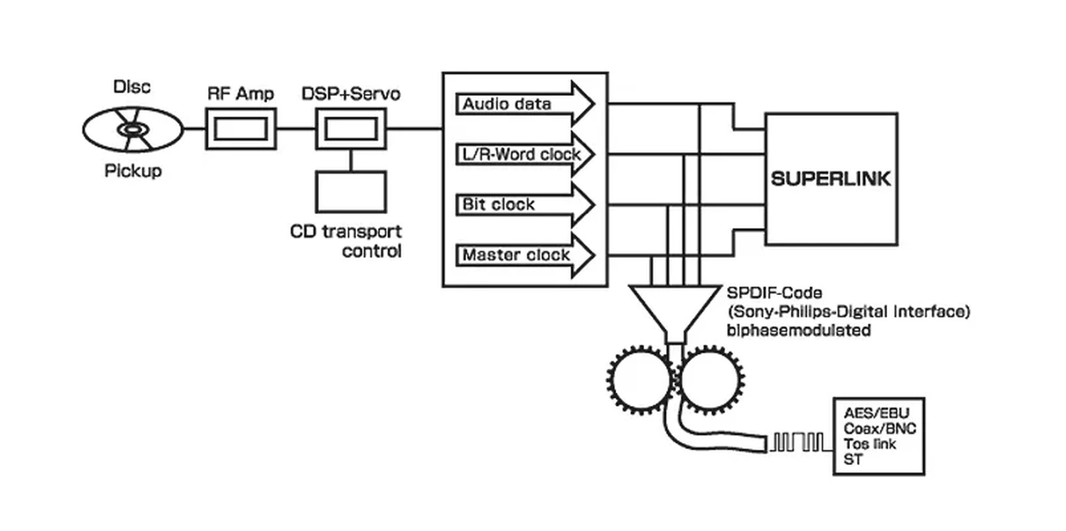 En effet, le système CEC SUPERLINK transmet les signaux musicaux et les signaux d’horloge de synchronisation séparément avec 4 câbles BNC 75Ω, ne nécessitant aucun processus de codage/décodage pour la transmission de données, et utilisant l’horloge maître générée par le convertisseur N/A pour réaliser une synchronisation en boucle fermée. Le système de transmission minimise la détérioration du signal musical et la gigue.