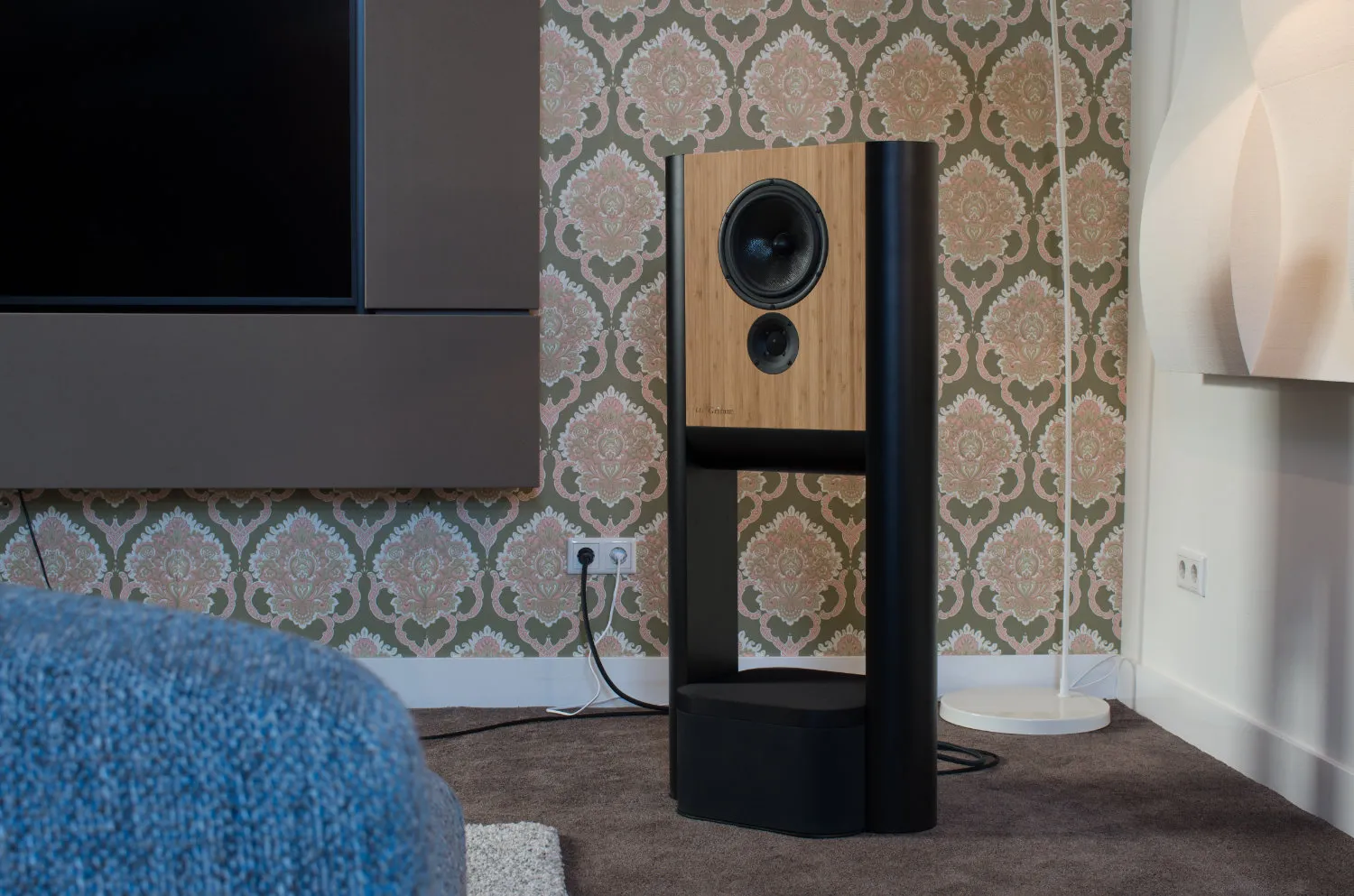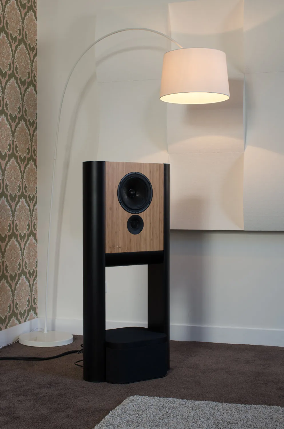 Le volume de 14 litres est plus large que profond, la caisse est scellée pour fournir un déflecteur efficace jusqu’à environ 250 Hz. Elle contient le woofer de 8″ ainsi que le tweeter à dôme de 1″ et est suspendue entre les deux demi cylindres des pieds qui combattent les diffractions. Le DSP linéarise la réponse en fréquence et permet une réponse contrôlée des basses jusqu’à 40 Hz.