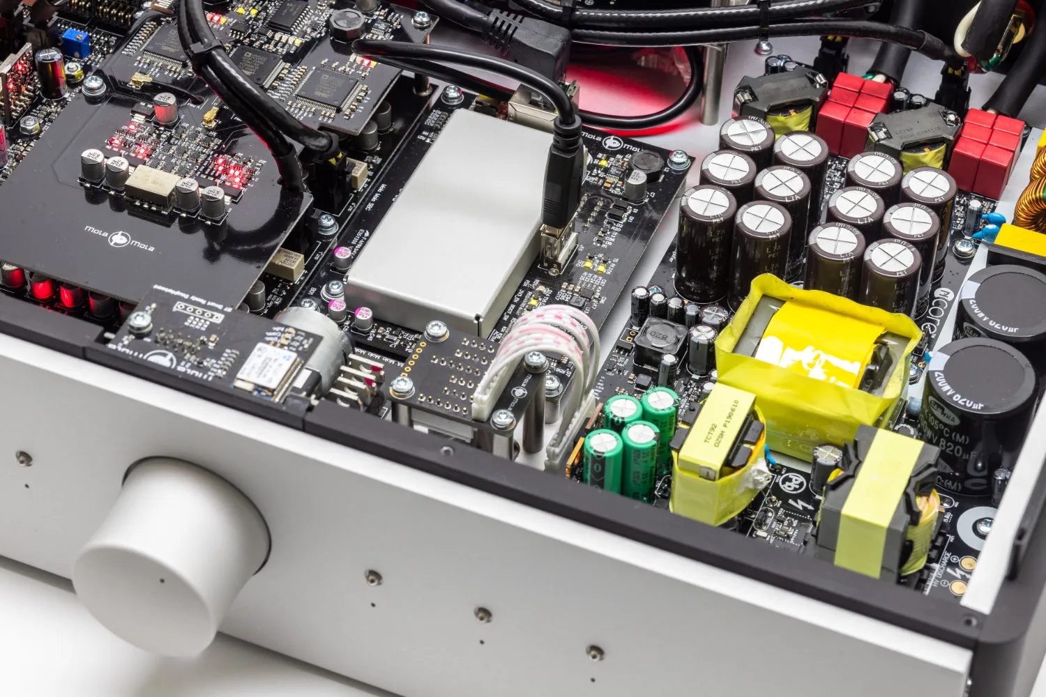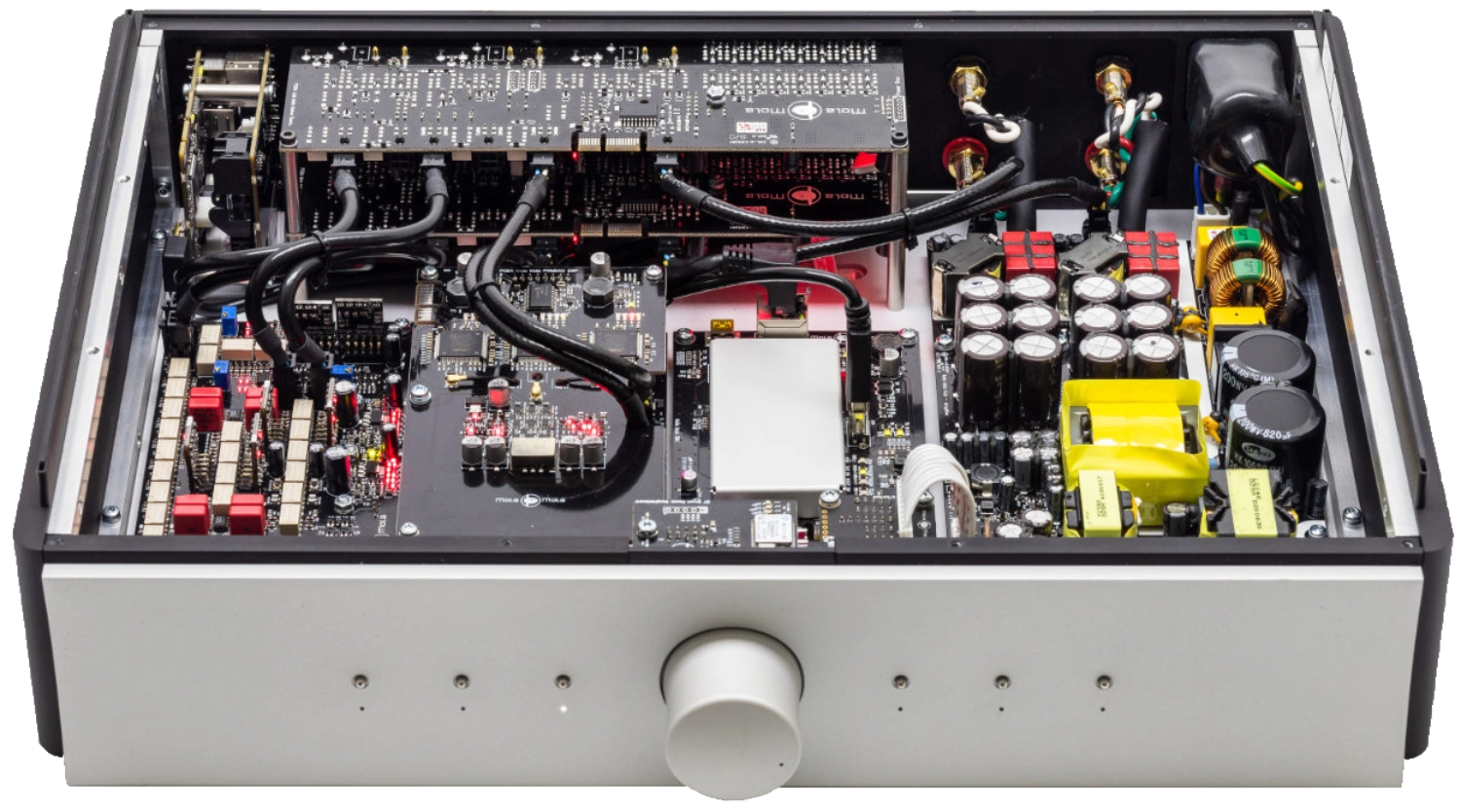 La section DAC en option du MOLA-MOLA Kula est donc celle du Tambaqui, DAC reconnu dans le monde entier comme étant l’un des tout meilleur convertisseur du marché. Grâce à cette carte, le Kula dispose alors de 5 entrées numériques : Bluetooth, Ethernet (RJ45), AES/EBU sur XLR 3 broches, RCA et TosLink (optique). Le MOLA-MOLA Kula devient compatible RoonReady par la même occasion, ce qui permet de le piloter directement via l’application Roon sur ordinateur (PC et Mac), smartphone (iOS et Android) ou encore tablette.
