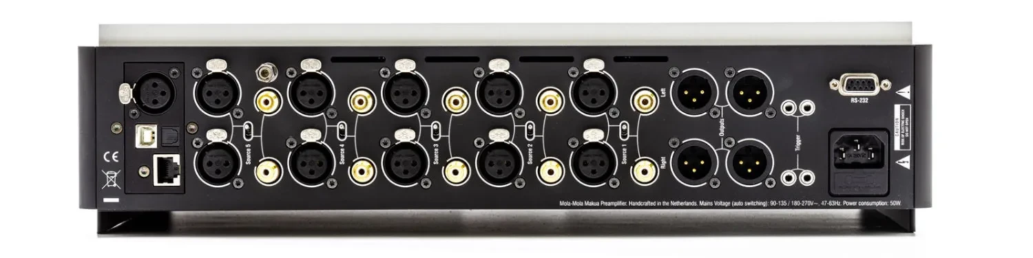 Le préamplificateur MOLA-MOLA Makua a été développé afin de proposer un appareil d’une extrême transparence et une fidélité sonore parfaite, tout en étant complet. Disposant de 5 entrées analogiques symétriques (XLR3) et asymétriques (RCA) dont chacune peut-être paramétrée comme entrée ligne ou comme entrée phono grâce à l’application.