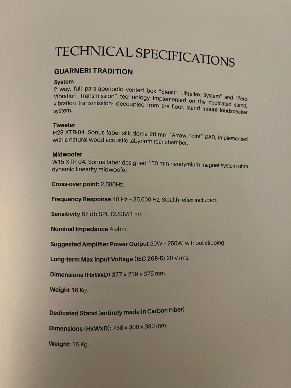 Sur le plan acoustique, la Guarneri exploite des haut-parleurs exclusifs Sonus Faber, développés spécifiquement pour ce modèle. Le tweeter à dôme souple intègre la technologie D.A.D. (Damped Apex Dome), garantissant une reproduction des hautes fréquences à la fois douce, détaillée et parfaitement intégrée. Le médium-grave à membrane composite assure une restitution charnelle des voix, une texture réaliste des instruments acoustiques et une remarquable cohérence tonale.