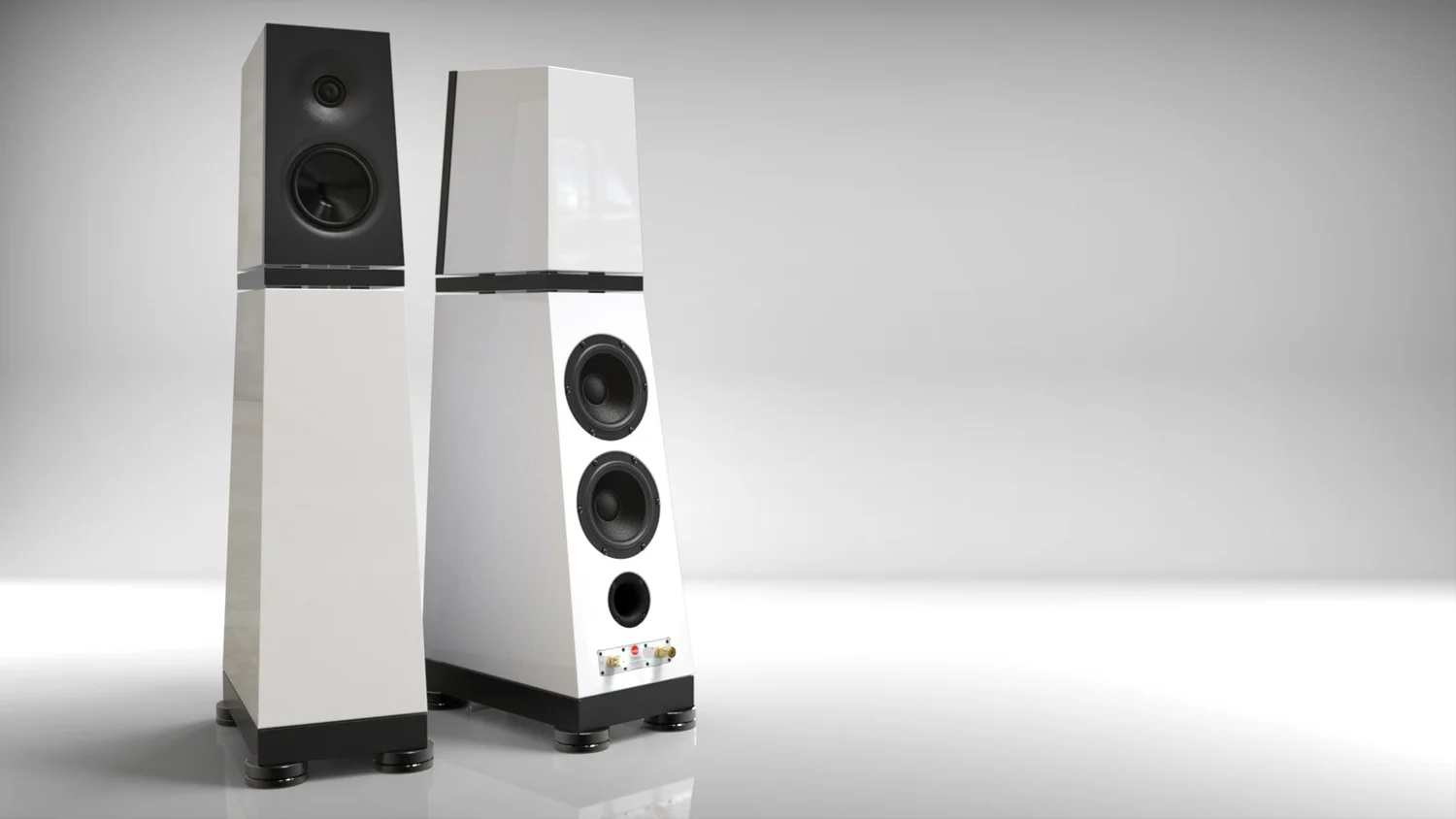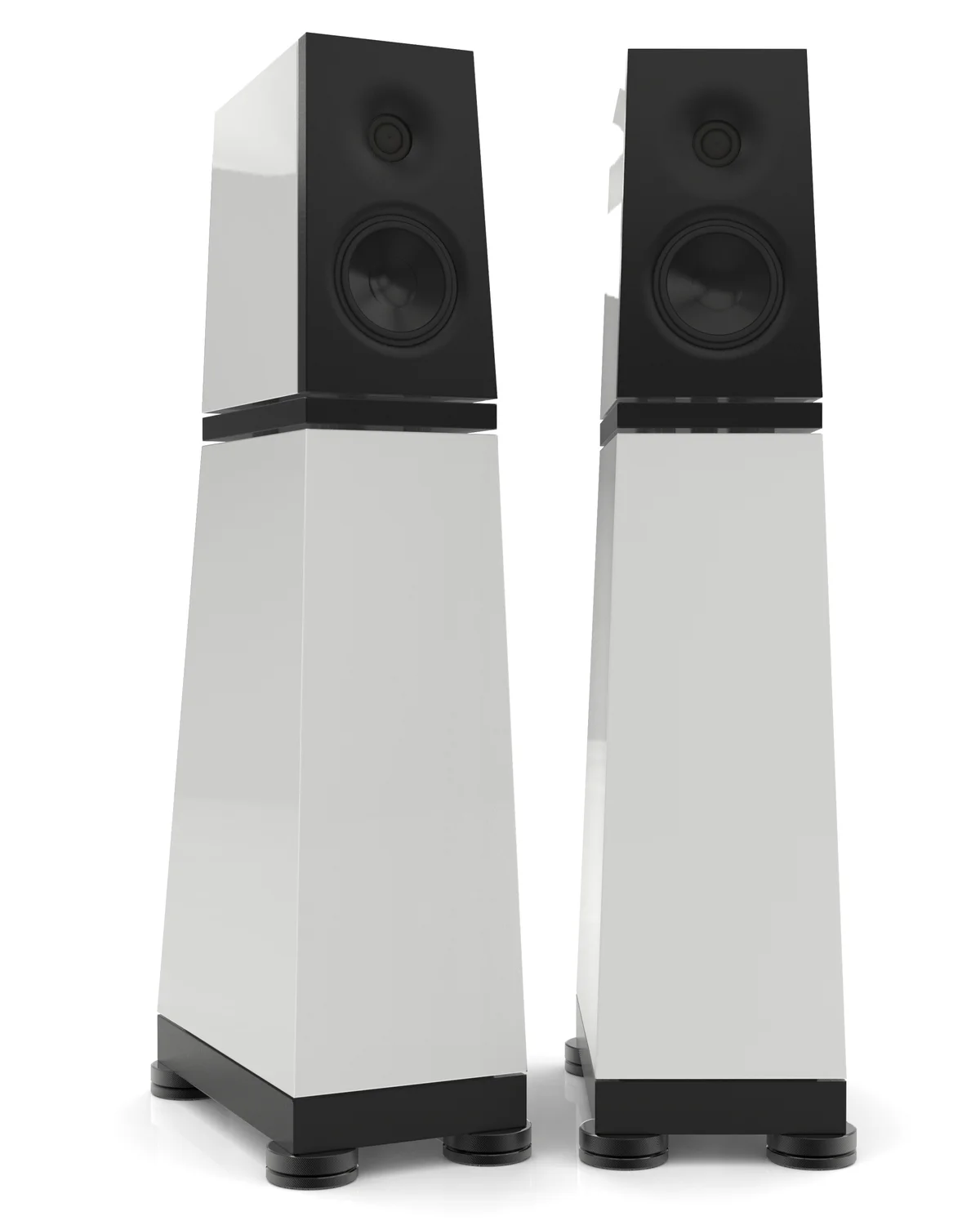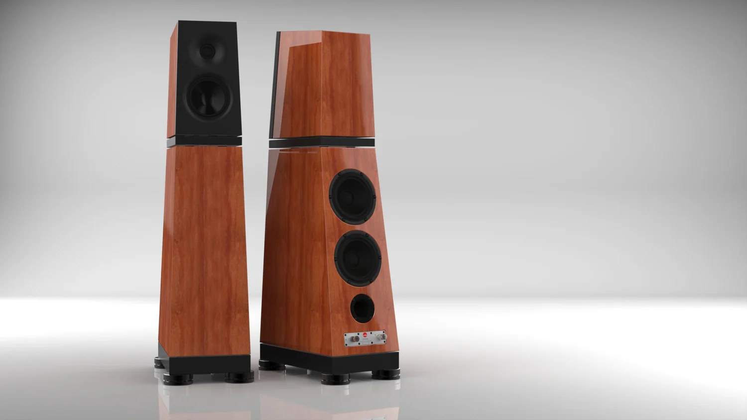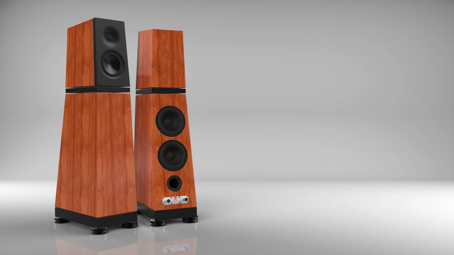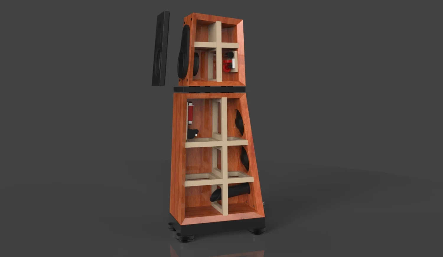 La VERITY AUDIO Otello est une enceinte colonne bass-reflex à trois voies, composée de deux modules isolés superposés. Le caisson supérieur de la VERITY AUDIO Otello est équipé d’un tweeter à dôme néo annulaire exclusif et d’un médium à large spectre. Le caisson inférieur abrite lui deux woofers bass-reflex tous deux situés à l’arrière. Les deux caissons superposés sont isolés entre eux par une plate-forme à couche contrainte couplée à des élastomères spéciaux. L’ensemble est couplé au sol par un système d’isolation dédié. Nous y reviendrons plus bas.