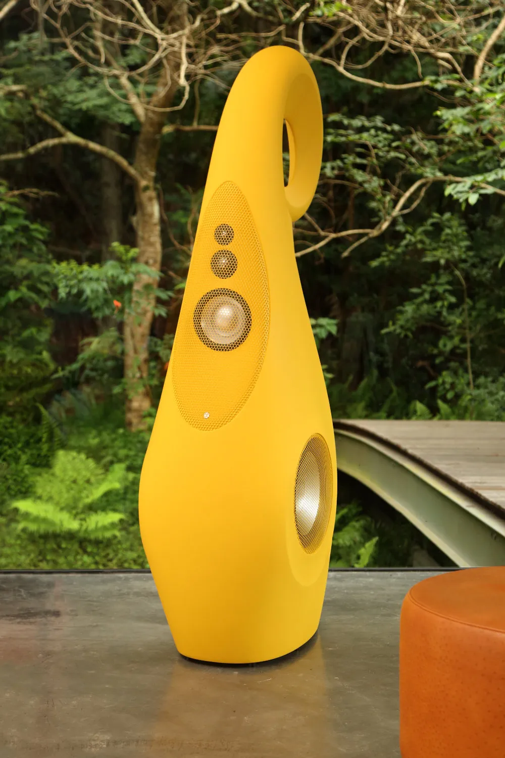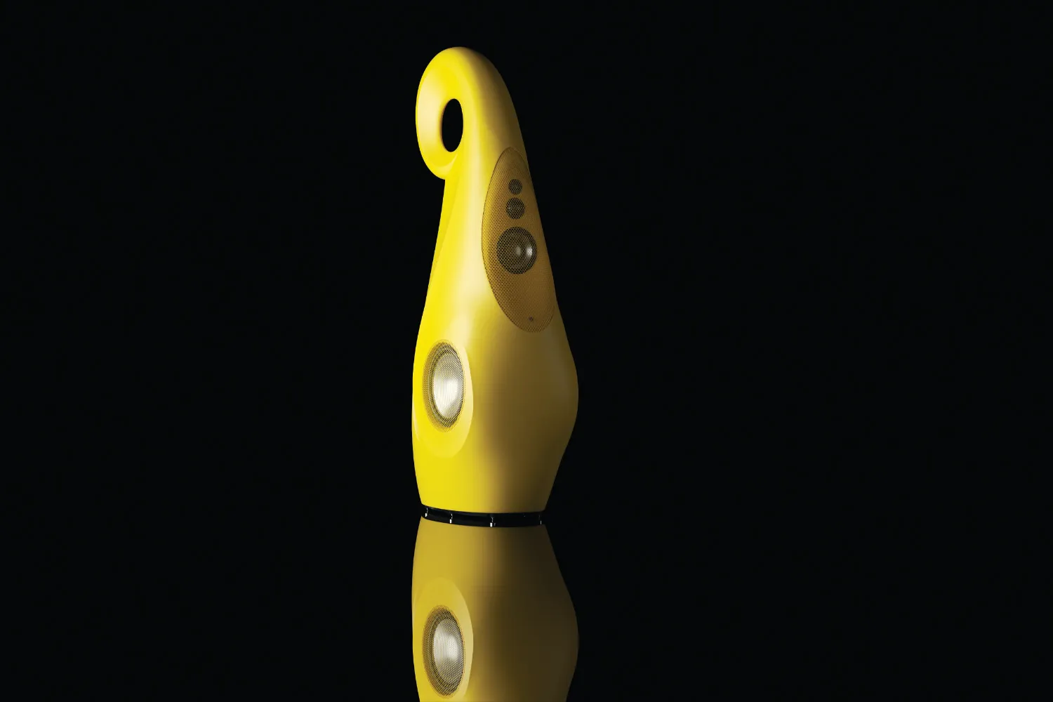 Enceinte colonne quatre voies Vivid Audio Spirit de la gamme Giya, de couleur jaune avec trois hauts-parleurs à l'avant (tweeter, haut-médium et bas-médium) et un haut-parleur de grave latéral de très grand diamètre