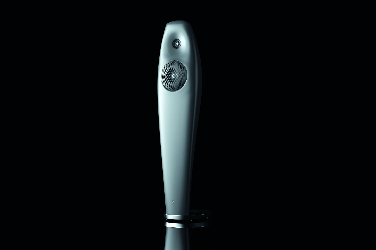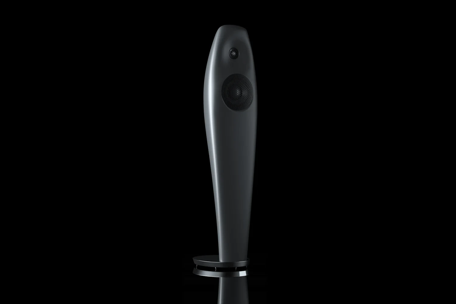 Enceinte colonne Vivid Audio Kaya 25 grise vu de face avec son twitter dans un renfoncement doux ainsi que le haut-parleur de médium-grave située en dessous. Le pieds est rond et repose sur des pointes.
